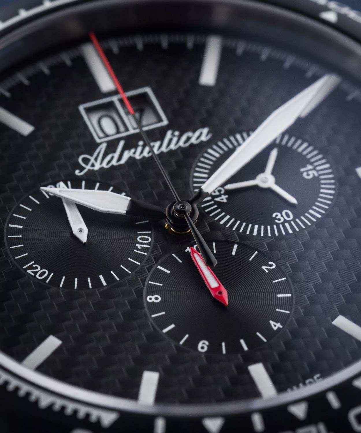 Мужские швейцарские часы-хронографХронографФункция позволяет измерять отрезки времени с особой точностью: часы, минуты, секунды. Верным признаком хронографа является наличие на циферблате 3 дополнительных окошек-счётчиков. с секундомеромСекундомерСекундоме́р — прибор, способный измерять интервалы времени с точностью до долей секунды. и тахиметромТахиметрРазмеченная шкала, располагается на ободке или безеле часов. Тахиметр позволяет рассчитать скорость на определённом участке пути, расстояние измеряется в километрах или милях. Adriatica Aviation A8383.4114CH воплощают в себе элегантность и функциональность, их выбирают целеустремленные мужчины, которые знают цену времени. Черный циферблат часов, защищенный сапфировым стекломСапфировое стеклоПрочный и надёжный материал из кристалла сапфира синтетического происхождения, характеризующийся особой твёрдостью и устойчивостью к царапинам и повреждениям., заключен в корпус из титана диаметром 46 мм и толщиной 12 мм. Надежный кварцевый механизм с калибром Ronda 5040.B обеспечивает высокую точность, а водозащита 5 ATM делает часы устойчивыми к воздействию воды. Стальной браслет с раскладной застёжкойРаскладная застёжкаТакой тип застёжки используется только на браслетах из металла. Она никогда не раскрывается полностью, происходит разделение на 2 и более частей. Раскладывающая застёжка снизит вероятность потери часов к минимуму. обеспечивает комфортное и надежное ношение. Циферблат с метками в виде штрихов имеет 3 дополнительных циферблата, а также окошко даты в положении «12» , что добавляет практичности в повседневной жизни. Люминесцентное покрытиеЛюминесцентное покрытиеПозволяет считывать показания времени в темноте. Производители наносят на стрелки, часовые индексы, безель или поверхность циферблата светонакопительный состав, дающий холодное свечение. на стрелках и метках обеспечивает отличную видимость в темноте.