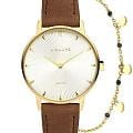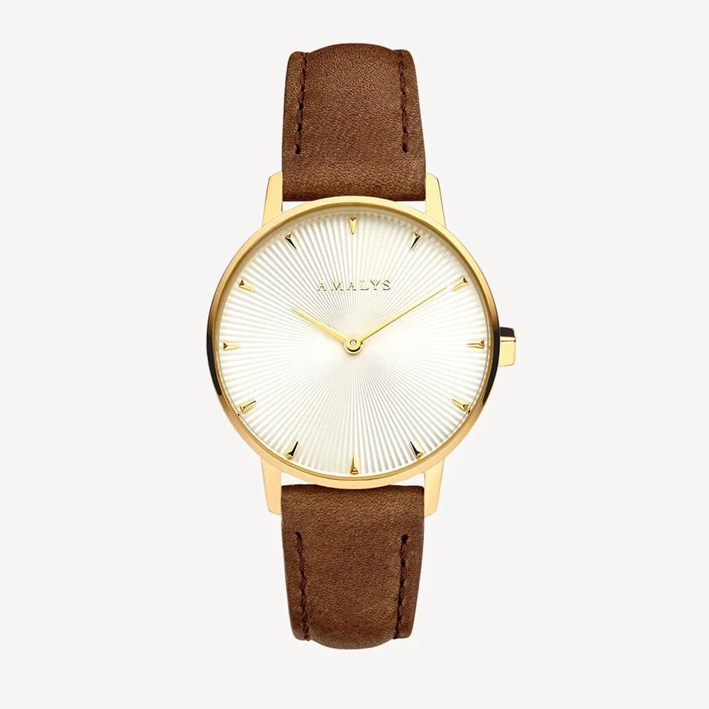 Amalys AMW-190 — женский набор, включающий часы и браслет, выполненный в едином элегантном стиле. Круглый корпус диаметром 33 мм изготовлен из нержавеющей стали с PVDPVDУльтратонкое покрытие наносится в технике вакуумного напыления, сочетает в себе нитрид титана особой прочности со слоем золота или оксида хрома. Несёт в себе декоративную или защитную функцию.-покрытием тёплого золотистого оттенка, что подчёркивает изысканный характер модели. Защитную функцию выполняет сапфировое стеклоСапфировое стеклоПрочный и надёжный материал из кристалла сапфира синтетического происхождения, характеризующийся особой твёрдостью и устойчивостью к царапинам и повреждениям., стойкое к царапинам и сохраняющее прозрачность. Механизм — кварцевый, обеспечивающий точность хода и удобство в использовании. Водозащита 3 ATM защищает от случайных брызг и дождя. Циферблат оформлен в минималистичном стиле с тонкими метками и изящными стрелками, подчёркивающими женственный образ. Ремешок выполнен из кожи шириной 16 мм, мягко облегает запястье и гармонично сочетается с корпусом. Дополняющий набор браслет усиливает впечатление цельности и придаёт образу завершённость.