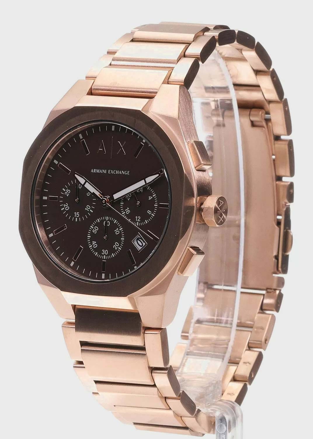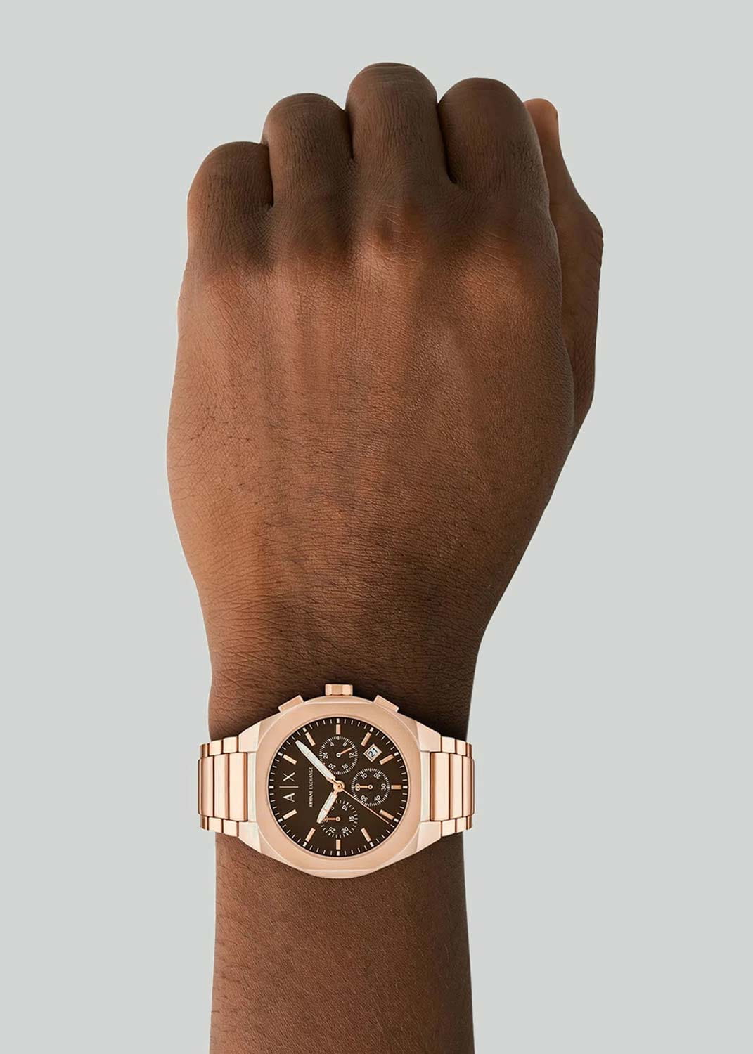 Мужские наручные часы-хронографХронографФункция позволяет измерять отрезки времени с особой точностью: часы, минуты, секунды. Верным признаком хронографа является наличие на циферблате 3 дополнительных окошек-счётчиков. с секундомеромСекундомерСекундоме́р — прибор, способный измерять интервалы времени с точностью до долей секунды. Armani Exchange Rafael AX4188 кварцевый механизм с высокой точностью. Корпус часов изготовлены из нержавеющей стали с IP-покрытиемIP-покрытиеМетод ионного напыления. Демонстрирует повышенную устойчивость к истиранию, окислению и химическим веществам. Под воздействием высокого давления и температуры около 1500°C молекулы металла надёжно соединяются с частицами корпуса часов. цвета розового золота. Минеральное стеклоМинеральное стеклоМинеральное стекло представляет собой искусственно выращенный минерал кварца. Такое стекло отличается особой устойчивостью к повреждениям и царапинам. Уступает по некоторым качествам сапфировому стеклу. защищает их от царапин и повреждений, сохраняя первозданный вид даже при активном использовании. Окошко даты находится в положении между 4 и 5 часов. Стрелки с люминесцентным покрытиемЛюминесцентное покрытиеПозволяет считывать показания времени в темноте. Производители наносят на стрелки, часовые индексы, безель или поверхность циферблата светонакопительный состав, дающий холодное свечение.. 12-ти и 24-х часовой формат времени. Стальной браслет с IP-покрытиемIP-покрытиеМетод ионного напыления. Демонстрирует повышенную устойчивость к истиранию, окислению и химическим веществам. Под воздействием высокого давления и температуры около 1500°C молекулы металла надёжно соединяются с частицами корпуса часов. на раскладной застёжкеРаскладная застёжкаТакой тип застёжки используется только на браслетах из металла. Она никогда не раскрывается полностью, происходит разделение на 2 и более частей. Раскладывающая застёжка снизит вероятность потери часов к минимуму. обеспечивает надежную фиксацию на запястье. Класс водозащиты: 50 метров позволит защитить корпус от случайных брызг или капель дождя. Эта модель – отличный выбор для тех, кто ищет сочетание стиля, качества и функциональности. Часы станут не только полезным аксессуаром, но и выразительным элементом вашего имиджа.