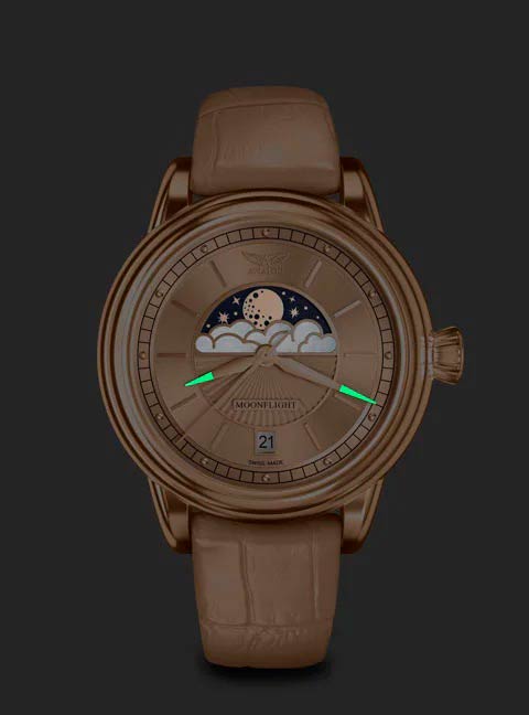 Aviator Douglas MoonFlight V.1.33.2.260.4 — элегантные дамские швейцарские часы с утончённой авиационной эстетикой. Корпус 36 мм из нержавеющей стали 316L с PVD-покрытиемPVDУльтратонкое покрытие наносится в технике вакуумного напыления, сочетает в себе нитрид титана особой прочности со слоем золота или оксида хрома. Несёт в себе декоративную или защитную функцию. обладает компактными пропорциями и удобным профилем. Циферблат в стиле Art Deco украшает усложнение фаз Луны в верхней половине, обрамлённой тонким кольцом облаков. Отмечено окно даты в положении «6 часов». Стрелки обработаны люминесцентным покрытиемЛюминесцентное покрытиеПозволяет считывать показания времени в темноте. Производители наносят на стрелки, часовые индексы, безель или поверхность циферблата светонакопительный состав, дающий холодное свечение. Superluminova — для уверенного считывания в темноте. Поверхность защищена сапфировым стекломСапфировое стеклоПрочный и надёжный материал из кристалла сапфира синтетического происхождения, характеризующийся особой твёрдостью и устойчивостью к царапинам и повреждениям. с антибликовым покрытиемАнтибликовое покрытиеСлой оксида металла в 0,13-0,3 микрон, благодаря которому стекло часов не бликует и не отражает свет. Антибликовое покрытие уменьшает отражение света в 10 раз, обеспечивая отличную читаемость показателей циферблата.. Сердце модели — швейцарский кварцевый механизм Ronda 708 с функцией отображения лунных фаз, 13 рубинами и возможностью работать до 54 месяцев без замены батареи. Завинчивающаяся задняя крышка с гравировкой Douglas DC-3 и водозащита до 100 метров создают надёжную основу для эксплуатации.Кожаный ремень со стандартной застежкой сочетает в себе комфорт, элегантность и практичность. Лимитированная серия - 950 экземпляров. Aviator Douglas MoonFlight — это гармоничное сочетание авиационного наследия, женской элегантности и технической изысканности, воплощённое в элегантном и функциональном аксессуаре.
