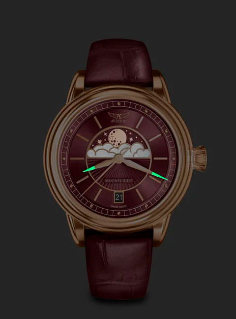 Aviator V.1.33.2.265.4 “Douglas Moonflight” — элегантный дамский швейцарский Moonphase с утончённой авиационной эстетикой. Корпус 36 мм из нержавеющей стали с PVD-покрытиемPVDУльтратонкое покрытие наносится в технике вакуумного напыления, сочетает в себе нитрид титана особой прочности со слоем золота или оксида хрома. Несёт в себе декоративную или защитную функцию. с полированной отделкой обладает компактными пропорциями и удобным литым профилем.