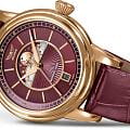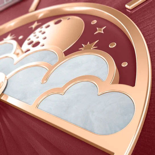 Циферблат в стиле Art Deco украшает усложнение фаз Луны в верхней половине, обрамлённой тонким кольцом облаков. Отмечено окно даты в положении «6 часов». Стрелки и накладные метки обработаны люминесцентным покрытиемЛюминесцентное покрытиеПозволяет считывать показания времени в темноте. Производители наносят на стрелки, часовые индексы, безель или поверхность циферблата светонакопительный состав, дающий холодное свечение. Superluminova — для уверенного считывания в темноте. Поверхность защищена сапфировым стекломСапфировое стеклоПрочный и надёжный материал из кристалла сапфира синтетического происхождения, характеризующийся особой твёрдостью и устойчивостью к царапинам и повреждениям. с антибликовым покрытием.