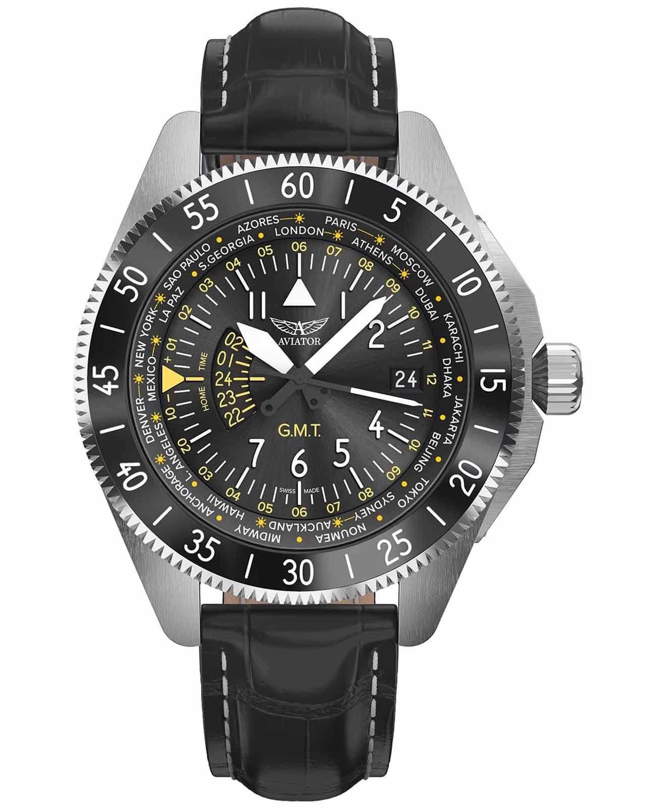 Aviator Airacobra V.1.37.0.307.4 “Airacobra GMT” — сбалансированный швейцарский пилотский GMT‑хронометр, сочетающий техническую строгость с удобными функциями для путешествий. Корпус диаметром 43 мм из нержавеющей стали обеспечивает уверенное ощущение надёжности, а герметичность до 100 м защищает при любой погоде .