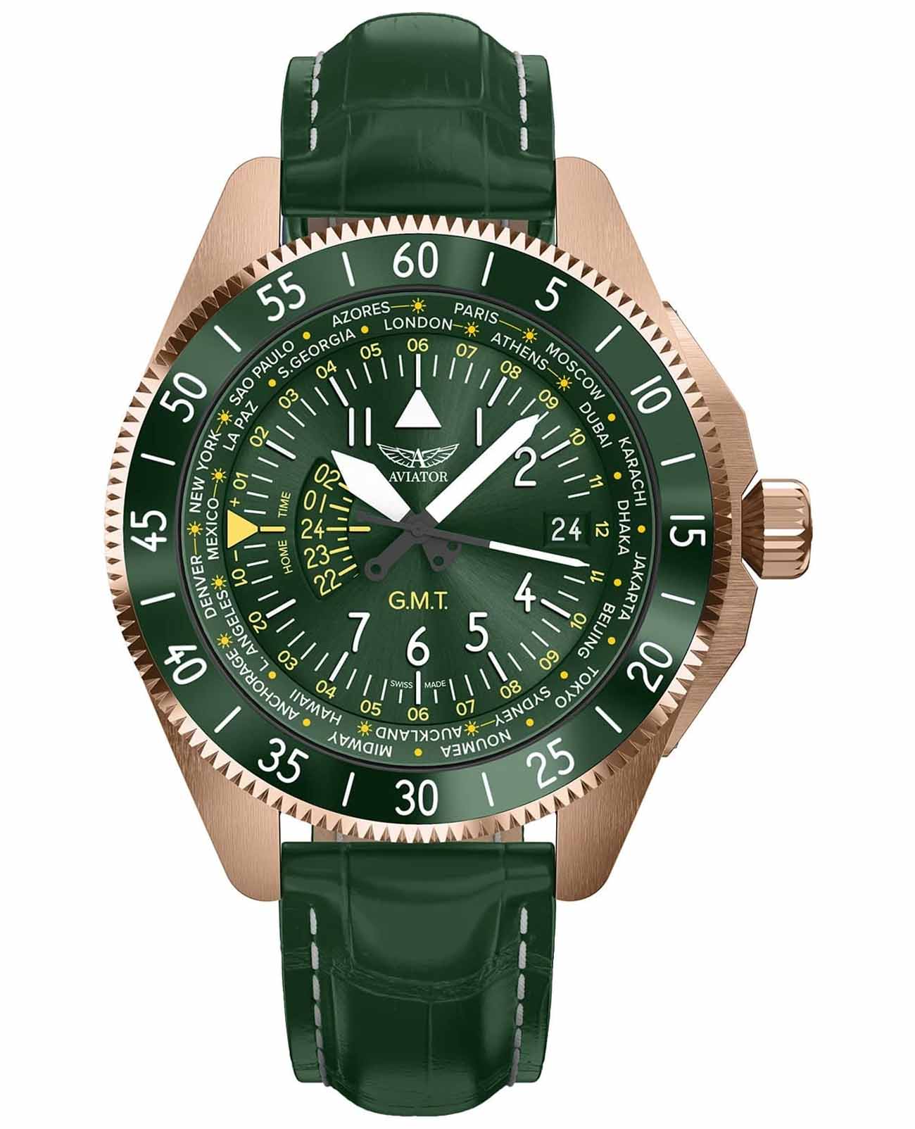 Aviator Airacobra V.1.37.2.309.4 “Airacobra GMT” — сбалансированный швейцарский пилотский GMT‑хронометр, сочетающий техническую строгость с удобными функциями для путешествий. Корпус диаметром 43 мм из нержавеющей стали с PVD-покрытиемPVDУльтратонкое покрытие наносится в технике вакуумного напыления, сочетает в себе нитрид титана особой прочности со слоем золота или оксида хрома. Несёт в себе декоративную или защитную функцию. обеспечивает уверенное ощущение надёжности, а герметичность до 100 м защищает при любой погоде .