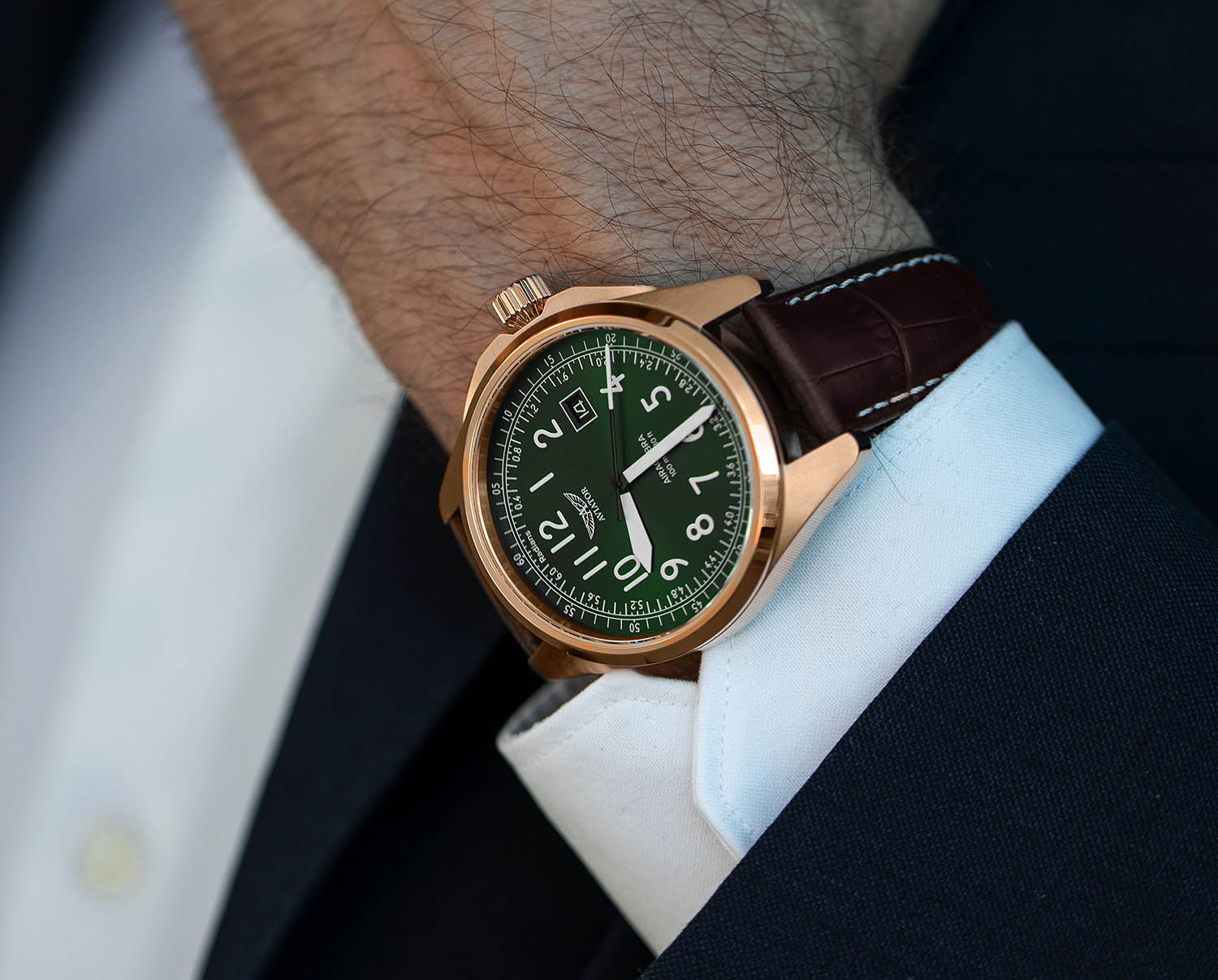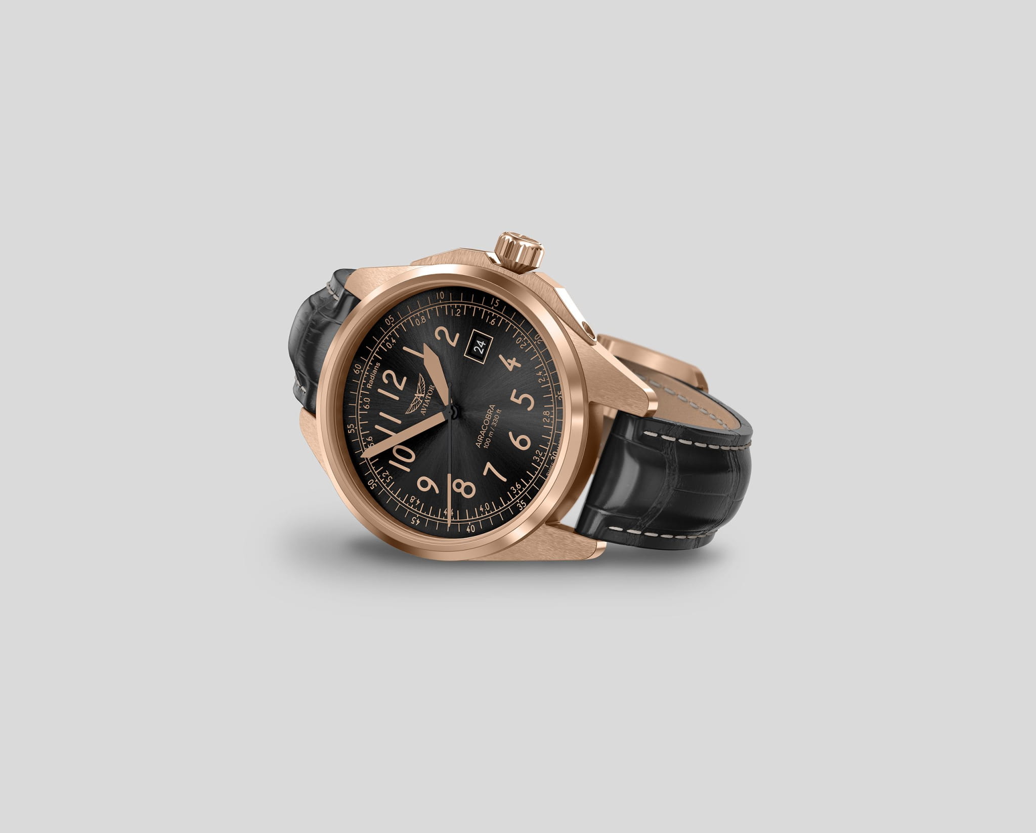 Aviator Airacobra 43 Type B V.1.38.2.324.4 — надёжные швейцарские пилотские часы с насыщенным функционалом и строгим авиационным дизайном. Корпус диаметром 42,8 мм выполнен из нержавеющей стали 316L с PVD-покрытиемPVDУльтратонкое покрытие наносится в технике вакуумного напыления, сочетает в себе нитрид титана особой прочности со слоем золота или оксида хрома. Несёт в себе декоративную или защитную функцию.. Циферблат имеет крупные арабские цифры и жёсткий контраст, соответствующий классическим пилотским образцам. Стрелки и метки покрыты люминесцентным покрытиемЛюминесцентное покрытиеПозволяет считывать показания времени в темноте. Производители наносят на стрелки, часовые индексы, безель или поверхность циферблата светонакопительный состав, дающий холодное свечение. Superluminova — это обеспечивает отличную читаемость в любых условиях. Окошко даты расположено у отметки «3 часа». На борту установлен швейцарский кварцевый механизм, способный с высокой точностью отображать время, дату. Циферблат защищён стойким сапфировым стекломСапфировое стеклоПрочный и надёжный материал из кристалла сапфира синтетического происхождения, характеризующийся особой твёрдостью и устойчивостью к царапинам и повреждениям. с антибликовым покрытиемАнтибликовое покрытиеСлой оксида металла в 0,13-0,3 микрон, благодаря которому стекло часов не бликует и не отражает свет. Антибликовое покрытие уменьшает отражение света в 10 раз, обеспечивая отличную читаемость показателей циферблата., завинчивающаяся заводная головка и задняя крышка обеспечивают уровень водозащиты до 100 метров. Кожаный ремень со стандартной застежкой обеспечивает удобство и надёжную фиксацию. Airacobra 43 Type B — инструментальные пилотские часы для тех, кто ценит надёжность, точность и удобную функциональность второго часового пояса в эстетике классических авиационных хронометров. Лимитированная серия.