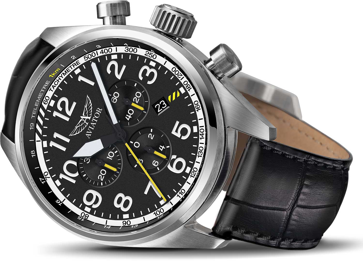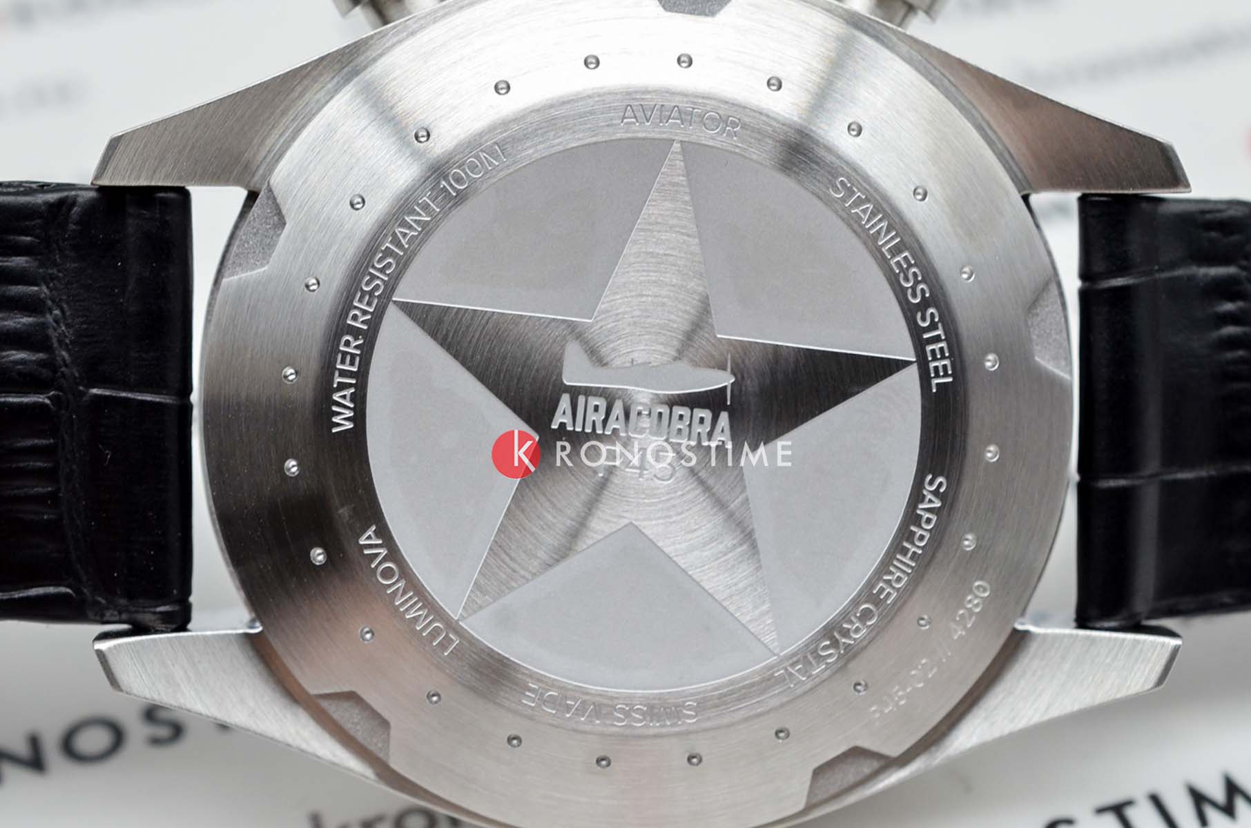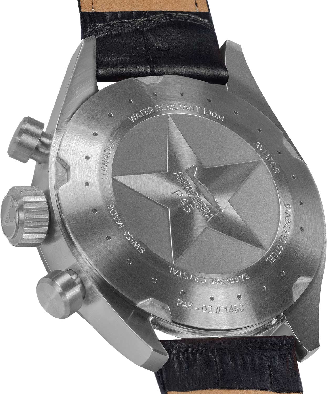Aviator Airacobra V.2.25.0.169.4 — швейцарский GMT-хронограф в духе пилотских инструментов, объединяющий точность, удобство и лаконичный дизайн. Диаметр корпуса — 45 мм, выполнен из нержавеющей стали, что подчёркивает техническую надёжность в образе часов.