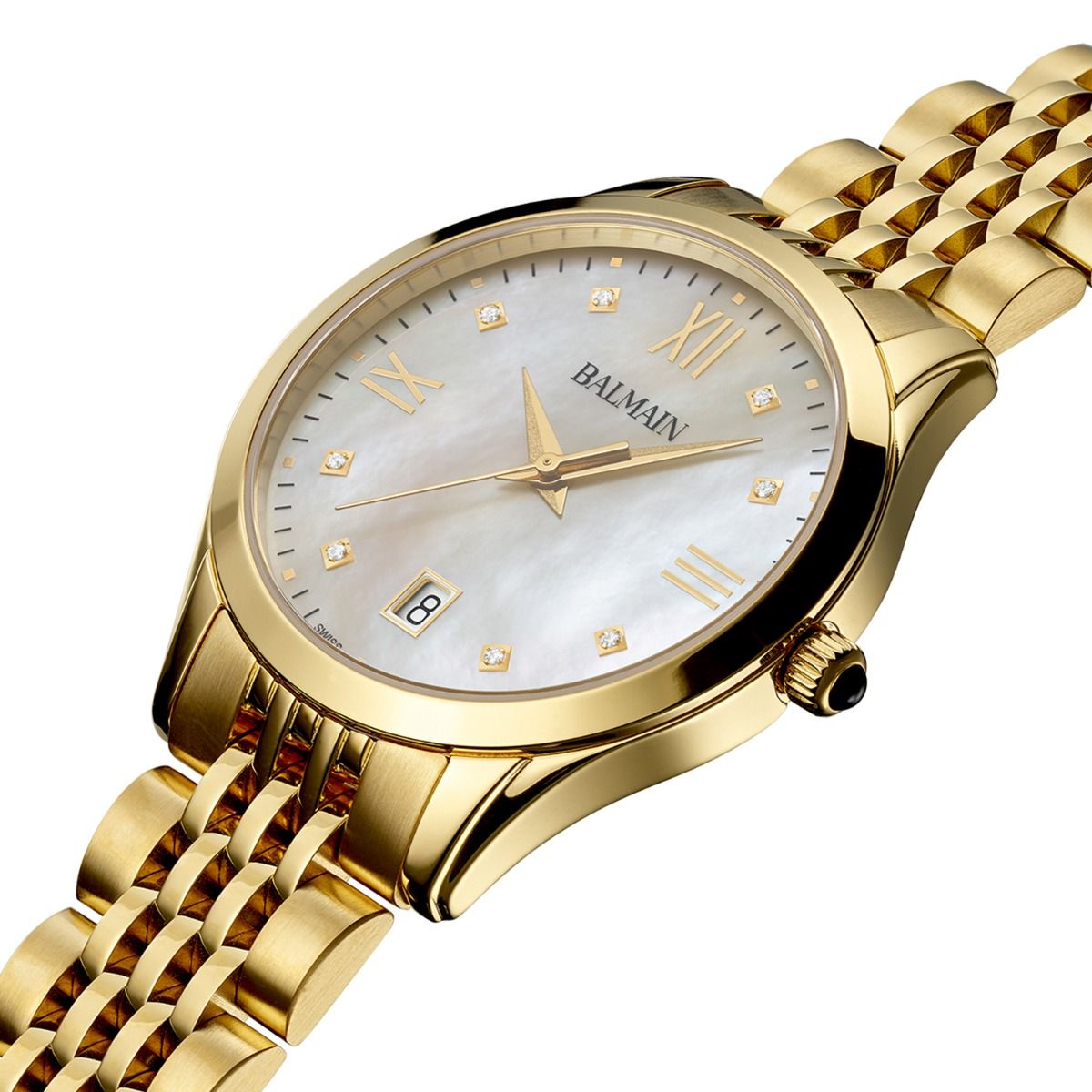 Женские часы Balmain Classic R B4310.31.82 кварцевый механизм с высокой точностью. Сапфировое стеклоСапфировое стеклоПрочный и надёжный материал из кристалла сапфира синтетического происхождения, характеризующийся особой твёрдостью и устойчивостью к царапинам и повреждениям. устойчивое к появлению царапин, обладающее высокой прозрачностью. Корпус изготовлен из нержавеющей стали PVD-покрытиемPVDУльтратонкое покрытие наносится в технике вакуумного напыления, сочетает в себе нитрид титана особой прочности со слоем золота или оксида хрома. Несёт в себе декоративную или защитную функцию.. Класс водозащиты: 50 метров, позволит защитить корпус от случайных брызг или капель дождя. Стальной браслет с PVD-покрытиемPVDУльтратонкое покрытие наносится в технике вакуумного напыления, сочетает в себе нитрид титана особой прочности со слоем золота или оксида хрома. Несёт в себе декоративную или защитную функцию.. на застёжке «бабочка» с кнопкамиЗастёжка "бабочка"Такой вид застёжки дополняется предохранителями, помогающими избежать случайного раскрытия браслета. Обладают изящным исполнением. . БезельБезельВнешний ободок, закрепляющий стекло. В спортивных часах так называется поворотное кольцо с делениями на циферблате, выполняет роль таймера – замеряет отрезки времени на шкале. Неподвижный безель – элемент декора. Однонаправленно вращающийся безель на дайверских часах позволяет фиксировать моменты погружения и выныривания на поверхность. с PVD-покрытиемPVDУльтратонкое покрытие наносится в технике вакуумного напыления, сочетает в себе нитрид титана особой прочности со слоем золота или оксида хрома. Несёт в себе декоративную или защитную функцию.. Календарь в положении 6 часов. Циферблат с 8 бриллиантами группы Top Wesselton VS-SI общим весом 0.030 карата