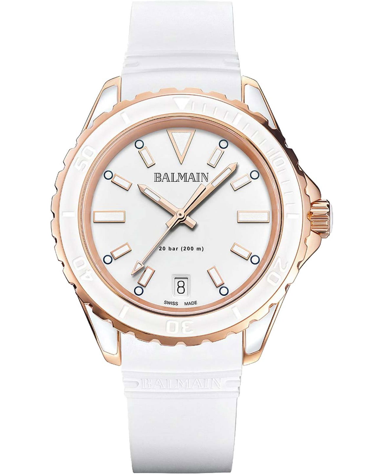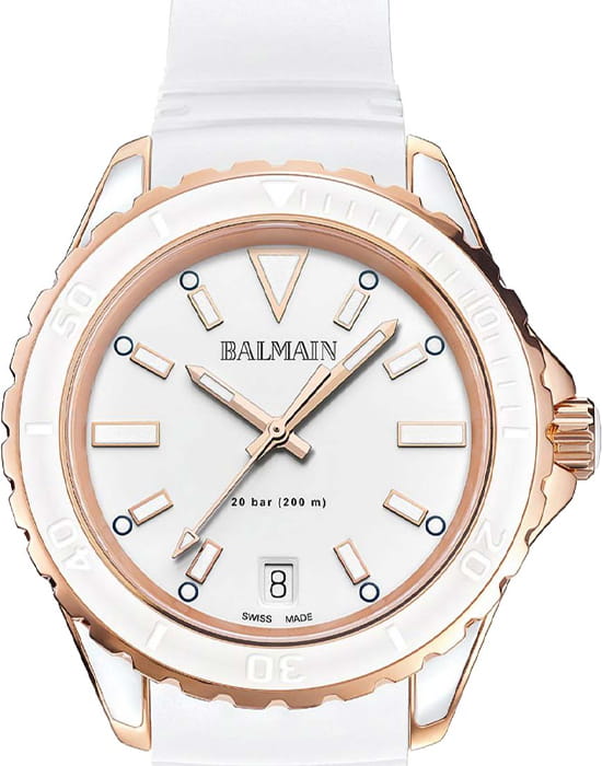 Женские часы Balmain Ophrys B4336.22.25 c кварцевый механизм с высокой точностью. Сапфировое стеклоСапфировое стеклоПрочный и надёжный материал из кристалла сапфира синтетического происхождения, характеризующийся особой твёрдостью и устойчивостью к царапинам и повреждениям. устойчивое к появлению царапин, обладающее высокой прозрачностью. Корпус изготовлен из нержавеющей стали. Класс водозащиты: 200 метров, позволит плавать, нырять и заниматься другими водными видами спорта. Каучуковый браслет на стандартной застежке. БезельБезельВнешний ободок, закрепляющий стекло. В спортивных часах так называется поворотное кольцо с делениями на циферблате, выполняет роль таймера – замеряет отрезки времени на шкале. Неподвижный безель – элемент декора. Однонаправленно вращающийся безель на дайверских часах позволяет фиксировать моменты погружения и выныривания на поверхность. с PVD-покрытиемPVDУльтратонкое покрытие наносится в технике вакуумного напыления, сочетает в себе нитрид титана особой прочности со слоем золота или оксида хрома. Несёт в себе декоративную или защитную функцию.. Дата в положении 6 часов. Стрелки и метки с люминесцентным покрытиемЛюминесцентное покрытиеПозволяет считывать показания времени в темноте. Производители наносят на стрелки, часовые индексы, безель или поверхность циферблата светонакопительный состав, дающий холодное свечение..