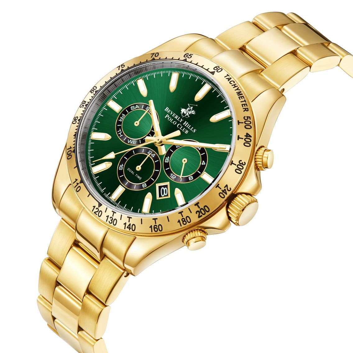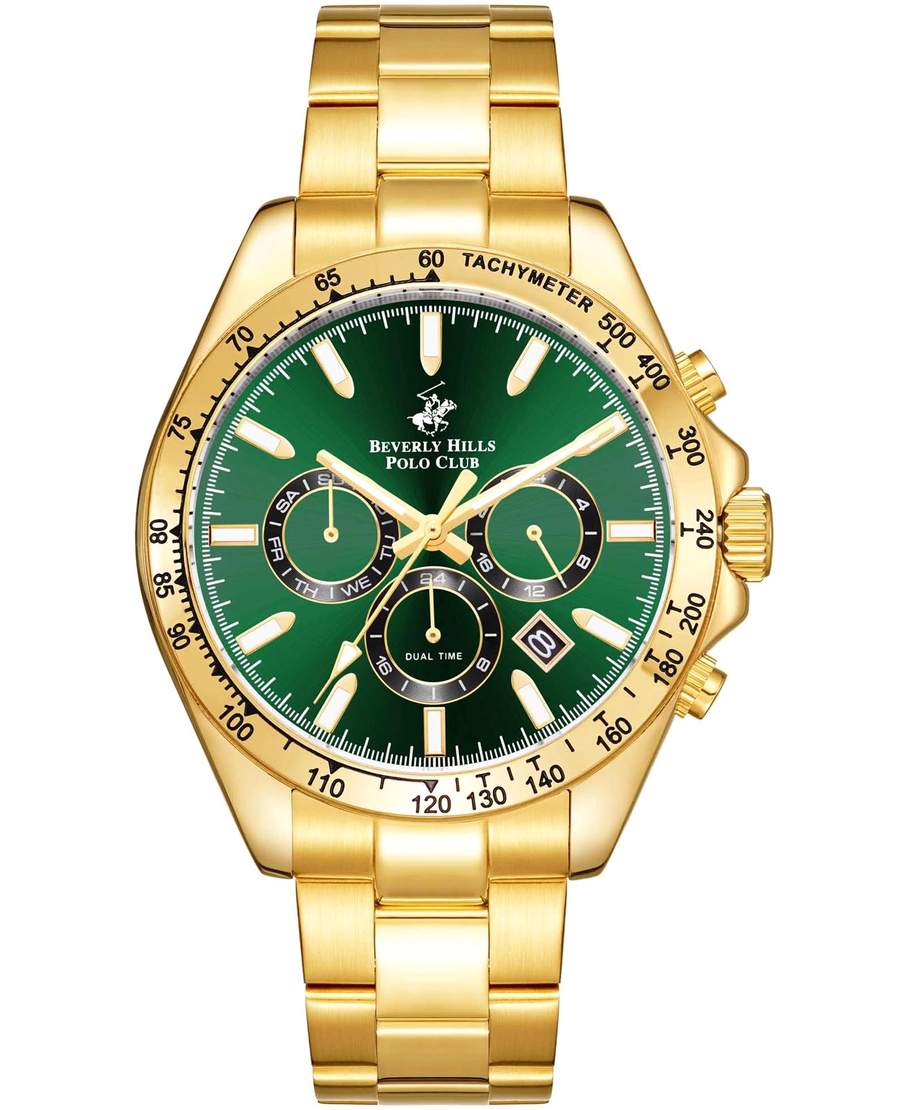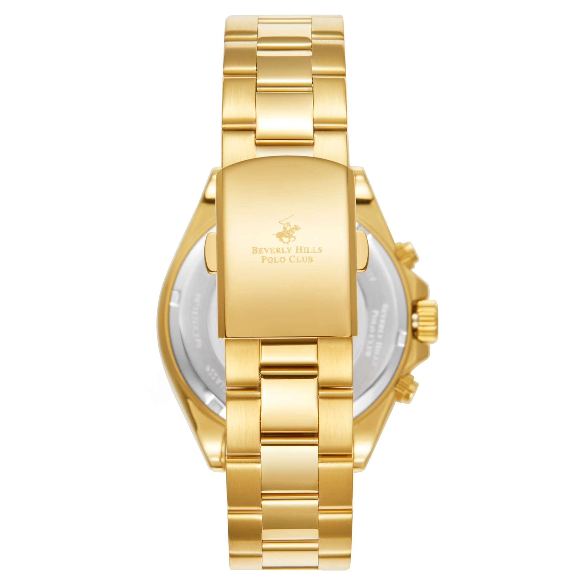 Американские мужские часы Beverly Hills Polo Club BP3127X.270 - это стильный мужской аксессуар, который сочетает элегантный дизайн и практичность. Корпус выполнен из нержавеющей стали с IP-покрытиемIP-покрытиеМетод ионного напыления. Демонстрирует повышенную устойчивость к истиранию, окислению и химическим веществам. Под воздействием высокого давления и температуры около 1500°C молекулы металла надёжно соединяются с частицами корпуса часов. золотого цвета, диаметром 42 мм, что обеспечивает долговечность и утончённый внешний вид. Надежное минеральное стеклоМинеральное стеклоМинеральное стекло представляет собой искусственно выращенный минерал кварца. Такое стекло отличается особой устойчивостью к повреждениям и царапинам. Уступает по некоторым качествам сапфировому стеклу. с сапфировым покрытием защищает циферблат от царапин и обеспечивает долговечность. Модель оснащена кварцевым механизмом, обеспечивающим высокую точность хода. На безелеБезельВнешний ободок, закрепляющий стекло. В спортивных часах так называется поворотное кольцо с делениями на циферблате, выполняет роль таймера – замеряет отрезки времени на шкале. Неподвижный безель – элемент декора. Однонаправленно вращающийся безель на дайверских часах позволяет фиксировать моменты погружения и выныривания на поверхность. шкала тахиметраТахиметрРазмеченная шкала, располагается на ободке или безеле часов. Тахиметр позволяет рассчитать скорость на определённом участке пути, расстояние измеряется в километрах или милях.. Стрелки и метки с люминесцентным покрытиемЛюминесцентное покрытиеПозволяет считывать показания времени в темноте. Производители наносят на стрелки, часовые индексы, безель или поверхность циферблата светонакопительный состав, дающий холодное свечение.. Стальной браслет с IP-покрытиемIP-покрытиеМетод ионного напыления. Демонстрирует повышенную устойчивость к истиранию, окислению и химическим веществам. Под воздействием высокого давления и температуры около 1500°C молекулы металла надёжно соединяются с частицами корпуса часов. на раскладной застёжкеРаскладная застёжкаТакой тип застёжки используется только на браслетах из металла. Она никогда не раскрывается полностью, происходит разделение на 2 и более частей. Раскладывающая застёжка снизит вероятность потери часов к минимуму. обеспечивает комфортное ношение. Окошко даты находится в положении между 4 и 5 часов. Водозащита 50 метров позволит защитить корпус от случайных брызг или капель дождя.