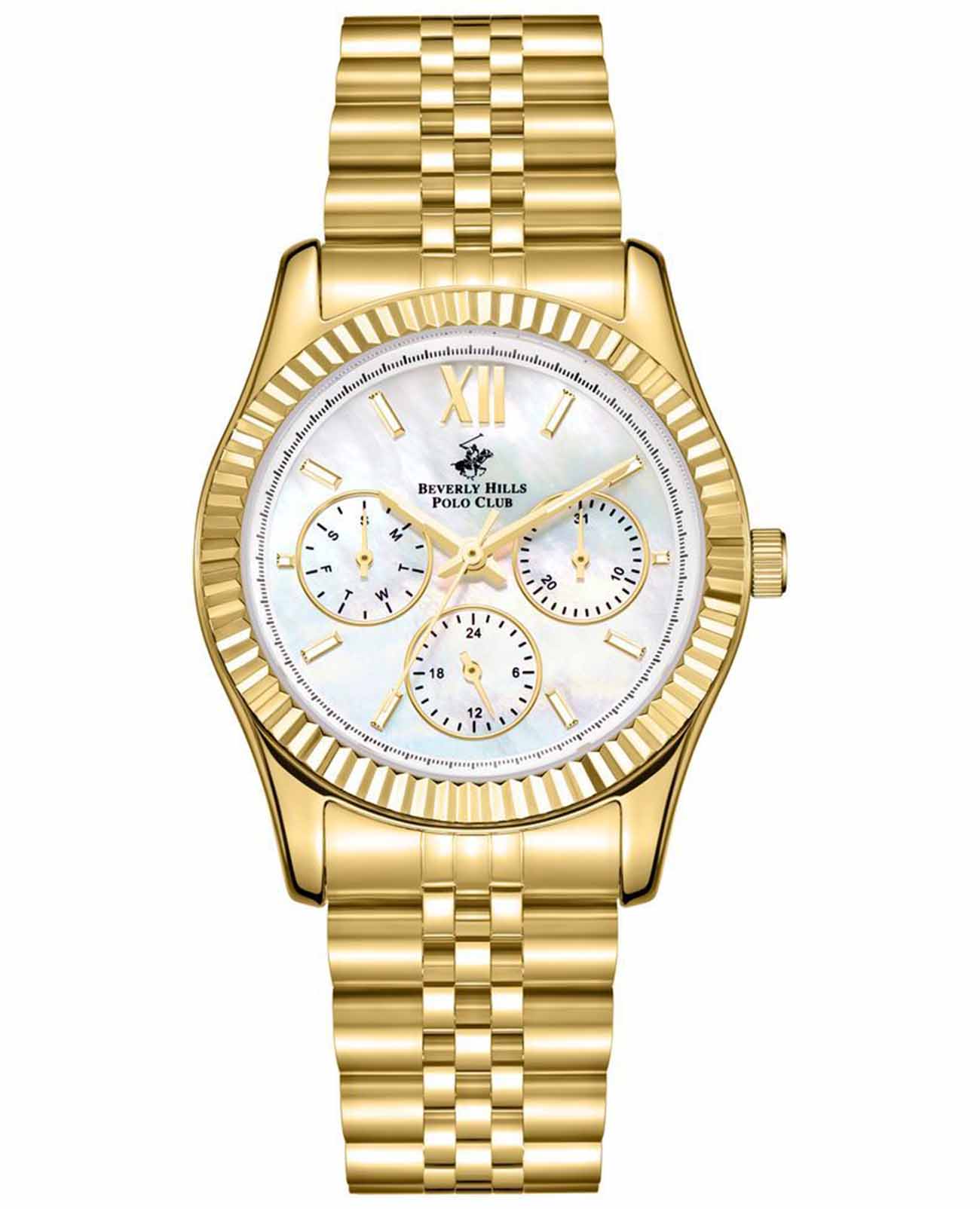 Beverly Hills Polo Club BP3169C.121 — женские часы, сочетающие изящество и функциональность в компактном формате. Корпус из суперметалла диаметром 34 мм и браслет украшены IP‑покрытиемIP-покрытиеМетод ионного напыления. Демонстрирует повышенную устойчивость к истиранию, окислению и химическим веществам. Под воздействием высокого давления и температуры около 1500°C молекулы металла надёжно соединяются с частицами корпуса часов. золотого оттенка, создавая благородный двуцветный дизайн. Циферблат перламутрового цвета украшен тремя субциферблатами — индикаторы даты, дня недели и 24‑часового формата — что придаёт модели утончённую многозадачность. Стрелки и метки выполнены в золоте, подчёркивая элегантность и визуальную лёгкость. Механизм — точный кварцевый, надёжный и неприхотливый, требующий только замены батареи раз в 1–2 года . Циферблат покрыт прочным минеральным стекломМинеральное стеклоМинеральное стекло представляет собой искусственно выращенный минерал кварца. Такое стекло отличается особой устойчивостью к повреждениям и царапинам. Уступает по некоторым качествам сапфировому стеклу., устойчивым к царапинам и сохраняющим безупречный внешний вид . Браслет на раскладной застёжкеРаскладная застёжкаТакой тип застёжки используется только на браслетах из металла. Она никогда не раскрывается полностью, происходит разделение на 2 и более частей. Раскладывающая застёжка снизит вероятность потери часов к минимуму., обеспечивая плавное и надёжное прилегание. Водозащита на уровне 3 ATM (≈30 м) защищает от брызг и случайных осадков . Beverly Hills Polo Club — утончённый аксессуар для женщин, ценящих стиль, надёжность и изысканные детали, где каждая функция подчёркнута строгой, но изящной эстетикой.