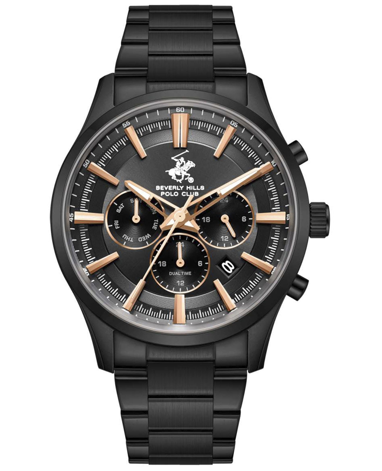 Мужские кварцевые часы Beverly Hills Polo Club — это воплощение лаконичности и эффектного стиля. Корпус диаметром 42 мм выполнен из стали 316L с IP-покрытиемIP-покрытиеМетод ионного напыления. Демонстрирует повышенную устойчивость к истиранию, окислению и химическим веществам. Под воздействием высокого давления и температуры около 1500°C молекулы металла надёжно соединяются с частицами корпуса часов. чёрного цвета. Циферблат чёрного цвета оформлен штрихами, стрелками и тремя вынесенными субциферблатами: для отображения дня недели, даты и 24-часового формата времени. Стрелки с люминесцентным покрытиемЛюминесцентное покрытиеПозволяет считывать показания времени в темноте. Производители наносят на стрелки, часовые индексы, безель или поверхность циферблата светонакопительный состав, дающий холодное свечение., обеспечивающим хорошую читаемость в темноте. Циферблат защищён минеральным стеклом с сапфировым покрытиемСапфировое стеклоПрочный и надёжный материал из кристалла сапфира синтетического происхождения, характеризующийся особой твёрдостью и устойчивостью к царапинам и повреждениям.. Часы оснащены стальным браслетом с IP-покрытиемIP-покрытиеМетод ионного напыления. Демонстрирует повышенную устойчивость к истиранию, окислению и химическим веществам. Под воздействием высокого давления и температуры около 1500°C молекулы металла надёжно соединяются с частицами корпуса часов. на раскладной застёжкеРаскладная застёжкаТакой тип застёжки используется только на браслетах из металла. Она никогда не раскрывается полностью, происходит разделение на 2 и более частей. Раскладывающая застёжка снизит вероятность потери часов к минимуму.. Водонепроницаемость 50 м позволяет использовать часы при мытье рук или в дождь. Идеальный выбор для тех, кто ценит американское качество и универсальный дизайн.
