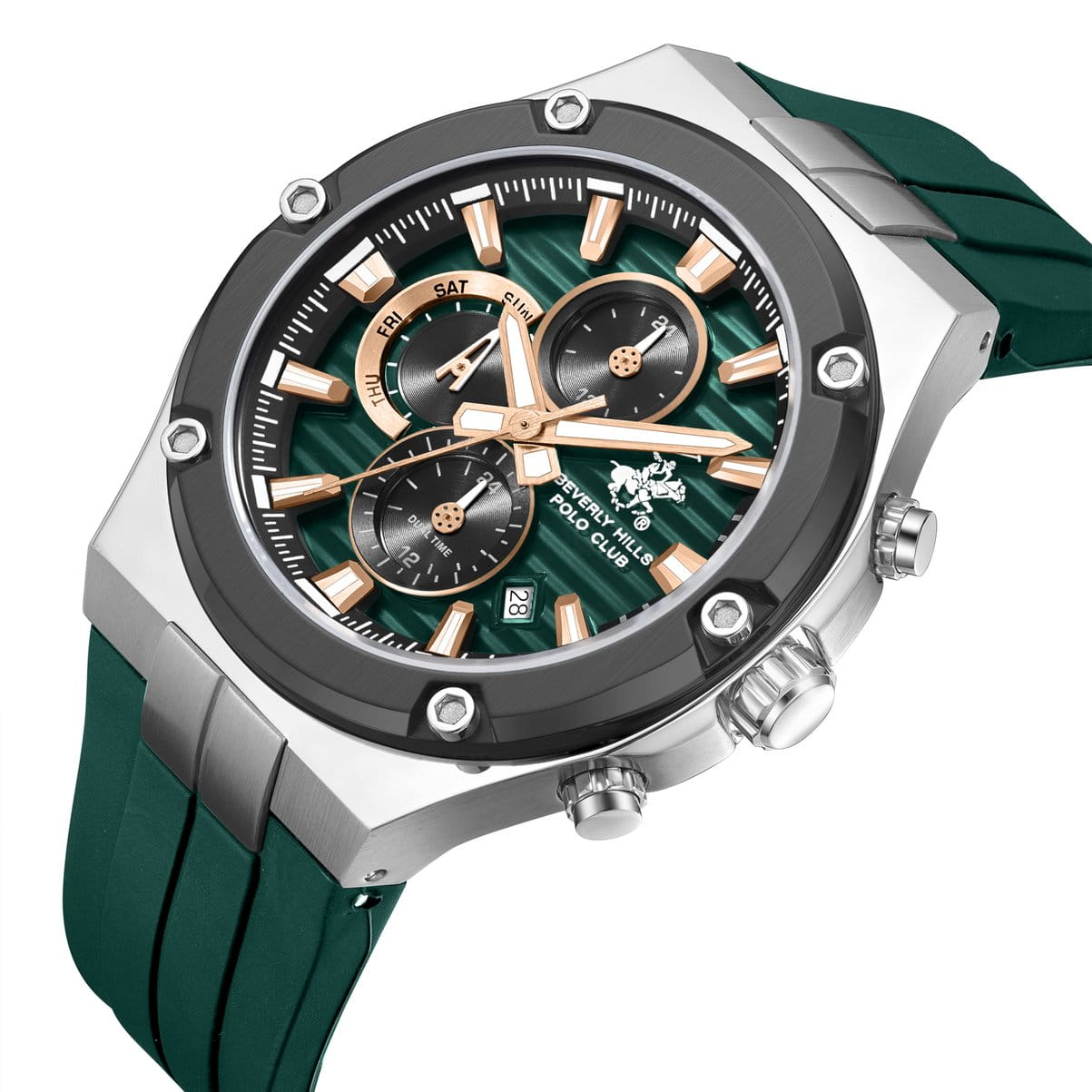 BEVERLY HILLS POLO CLUB BP3822X.375 — стильные мужские часы, сочетающие спортивную динамику и функциональность. Крупный корпус выполнен из нержавеющей стали серебристого цвета, диаметром 46,5 мм, гармонично дополнен каучуковым ремешком на стандартной застежке, что обеспечивает комфортное ношение. Минеральное стеклоМинеральное стеклоМинеральное стекло представляет собой искусственно выращенный минерал кварца. Такое стекло отличается особой устойчивостью к повреждениям и царапинам. Уступает по некоторым качествам сапфировому стеклу. с сапфировым покрытием защищает циферблат от царапин, а кварцевый механизм обеспечивает высокую точность. Благодаря своей универсальной эстетике эти часы уместны и в деловой среде, и в повседневном образе. Стрелки и метки с люминесцентным покрытиемЛюминесцентное покрытиеПозволяет считывать показания времени в темноте. Производители наносят на стрелки, часовые индексы, безель или поверхность циферблата светонакопительный состав, дающий холодное свечение., обеспечивающим хорошую читаемость в темноте. Указатель дня недели вынесен на отдельный циферблат, также присутствует индикация 24-часового формата времени. Окошко даты находится в положении между 4 и 5 часов. Идеальный выбор для тех, кто ценит элегантный дизайн и качество. Водозащита до 50 метров позволит защитить корпус от случайных брызг или капель дождя.