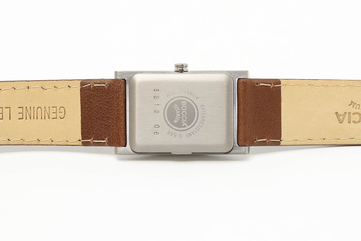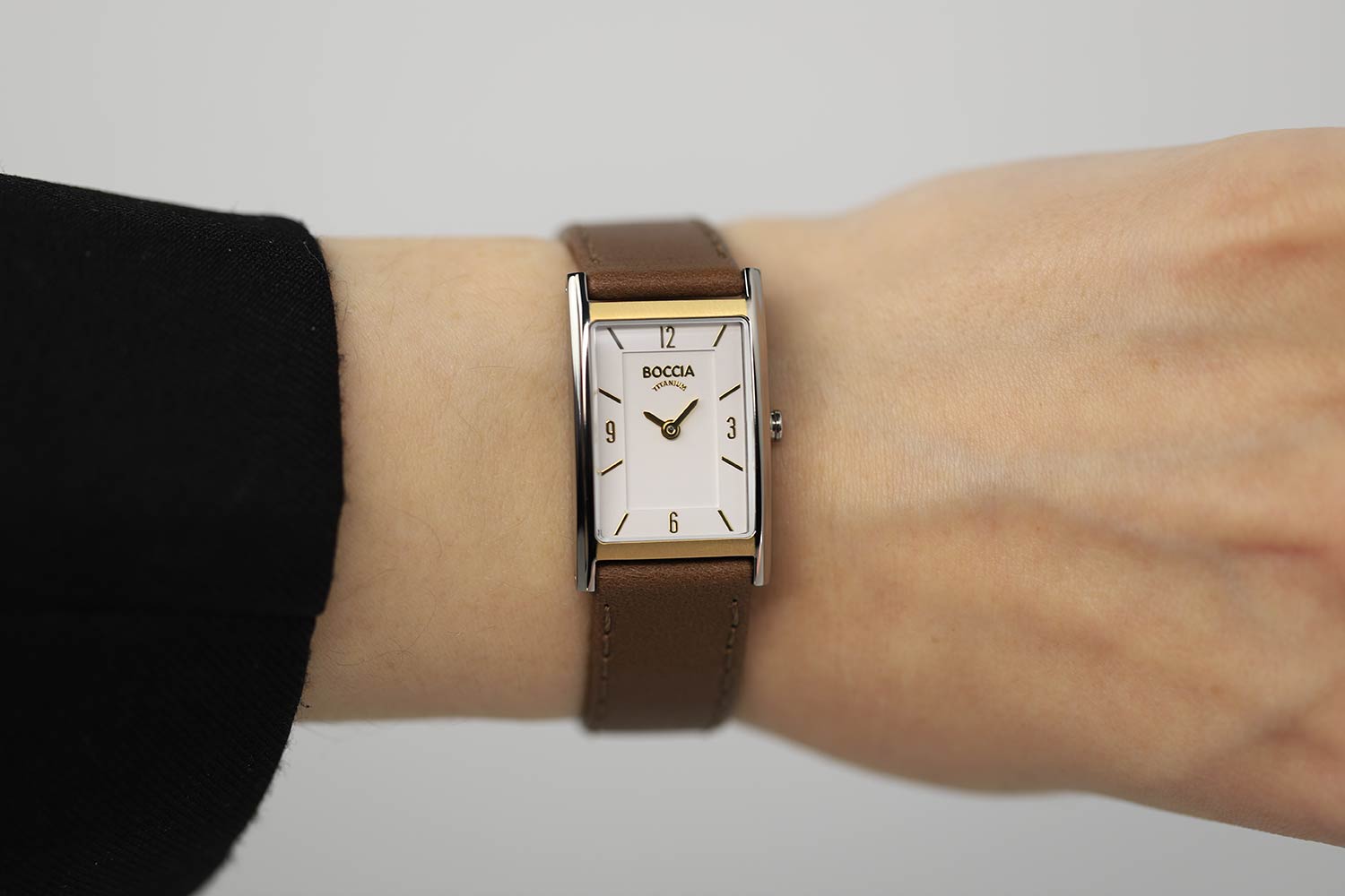 Женские наручные часы Boccia Titanium 3212-06 с надёжным кварцевым механизмом. Корпус часов изготовлен из титана с частичным PVD-покрытиемPVDУльтратонкое покрытие наносится в технике вакуумного напыления, сочетает в себе нитрид титана особой прочности со слоем золота или оксида хрома. Несёт в себе декоративную или защитную функцию.. Минеральное стеклоМинеральное стеклоМинеральное стекло представляет собой искусственно выращенный минерал кварца. Такое стекло отличается особой устойчивостью к повреждениям и царапинам. Уступает по некоторым качествам сапфировому стеклу. устойчивое к мелким механическим повреждениям. Кожаный ремешок на стандартной застёжке. Класс водозащиты: 50 метров, позволит защитить корпус от случайных брызг или капель дождя.
