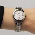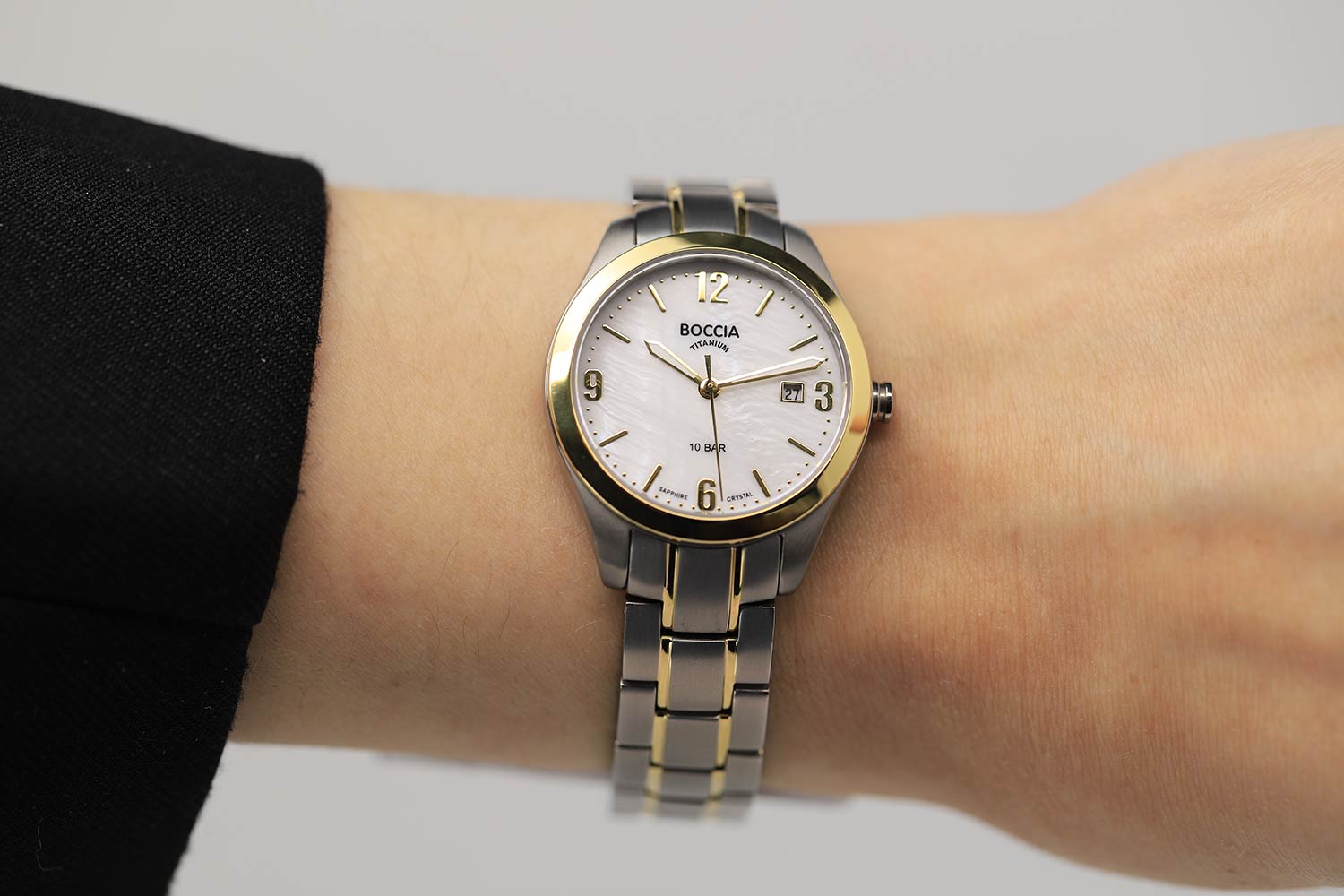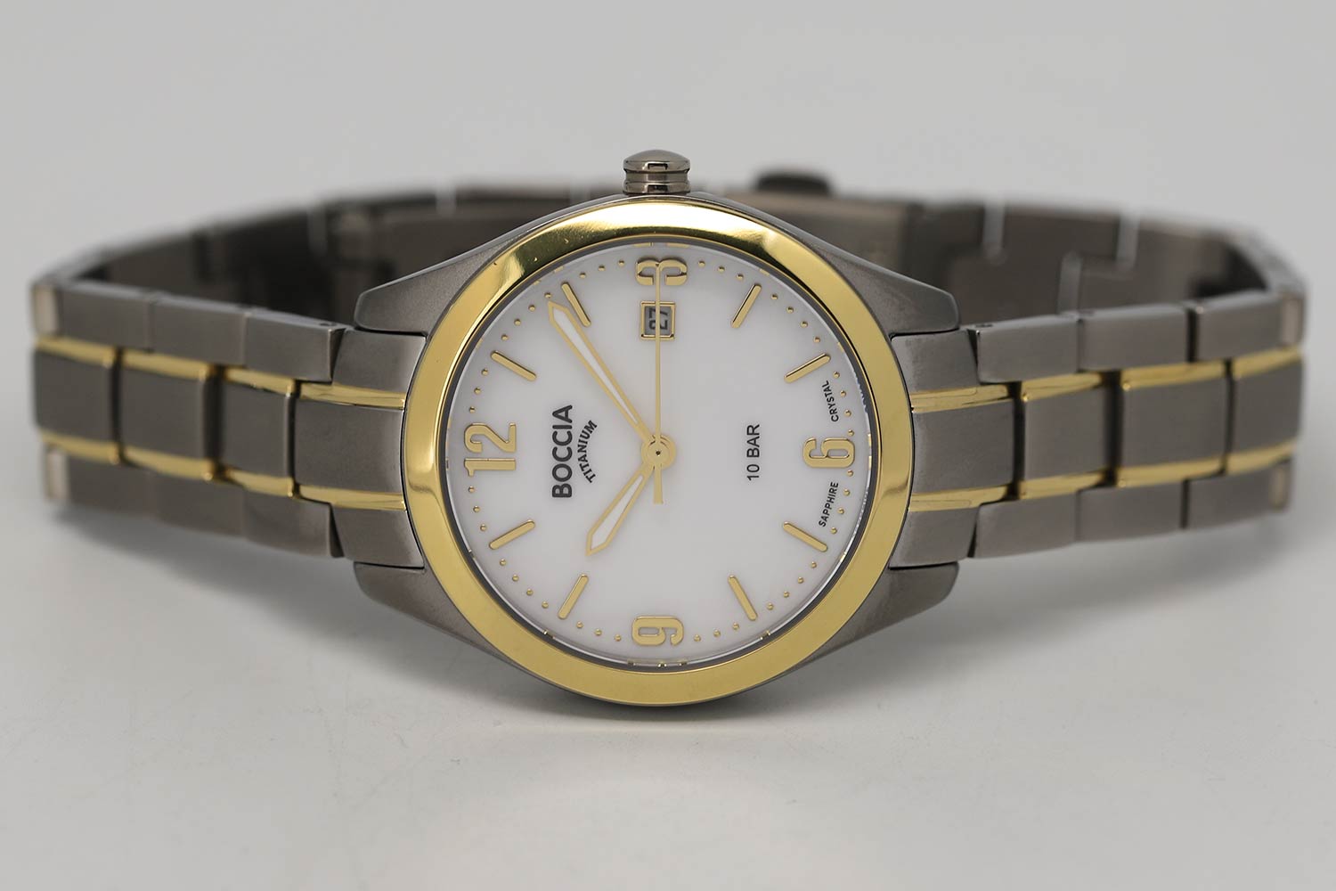 Женские наручные часы Boccia Titanium 3317-03 с надёжным кварцевым механизмом. Корпус и браслет часов изготовлены из титана. Сапфировое стеклоСапфировое стеклоПрочный и надёжный материал из кристалла сапфира синтетического происхождения, характеризующийся особой твёрдостью и устойчивостью к царапинам и повреждениям. устойчивое к мелким механическим повреждениям. Класс водозащиты: 100 метров, позволит плавать, нырять и заниматься другими водными видами спорта. Титановый браслет с частичным PVD-покрытиемPVDУльтратонкое покрытие наносится в технике вакуумного напыления, сочетает в себе нитрид титана особой прочности со слоем золота или оксида хрома. Несёт в себе декоративную или защитную функцию. на раскладной застёжкеРаскладная застёжкаТакой тип застёжки используется только на браслетах из металла. Она никогда не раскрывается полностью, происходит разделение на 2 и более частей. Раскладывающая застёжка снизит вероятность потери часов к минимуму.. Окошко даты находится в положении 3 часа. Стрелки с люминесцентным покрытиемЛюминесцентное покрытиеПозволяет считывать показания времени в темноте. Производители наносят на стрелки, часовые индексы, безель или поверхность циферблата светонакопительный состав, дающий холодное свечение..