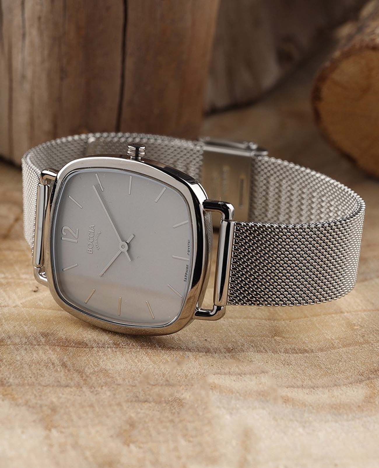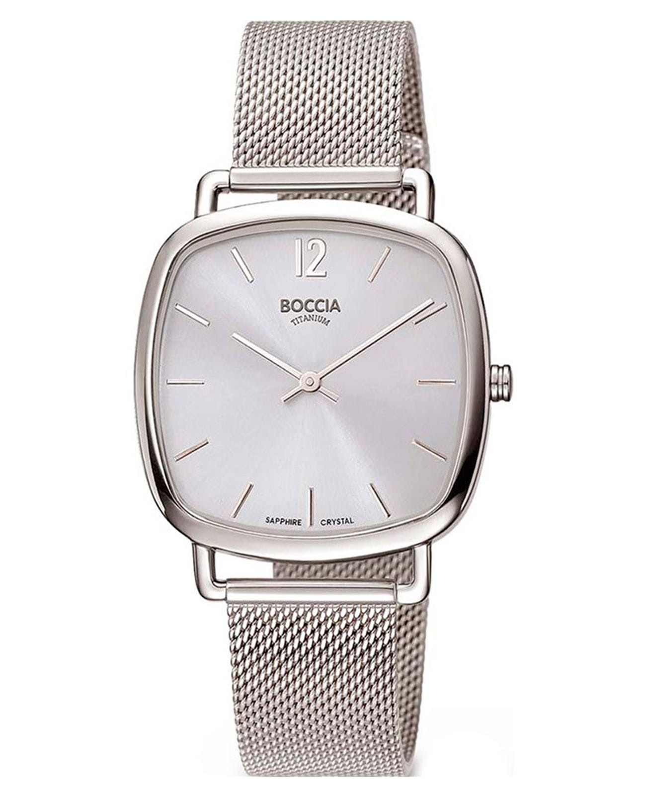 Женские немецкие титановые часы Boccia TitaniumSquare 3334-06, кварцевый механизм с высокой точностью. Минеральное стеклоМинеральное стеклоМинеральное стекло представляет собой искусственно выращенный минерал кварца. Такое стекло отличается особой устойчивостью к повреждениям и царапинам. Уступает по некоторым качествам сапфировому стеклу. устойчивое к появлению царапин, обладающее высокой прозрачностью. Квадратный корпус изготовлен из титана. Метки в виде штрихов. Класс водозащиты: 30 метров, позволит защитить корпус от случайных брызг или капель дождя. Стальной браслет миланского плетения на раскладной застёжкеРаскладная застёжкаТакой тип застёжки используется только на браслетах из металла. Она никогда не раскрывается полностью, происходит разделение на 2 и более частей. Раскладывающая застёжка снизит вероятность потери часов к минимуму..