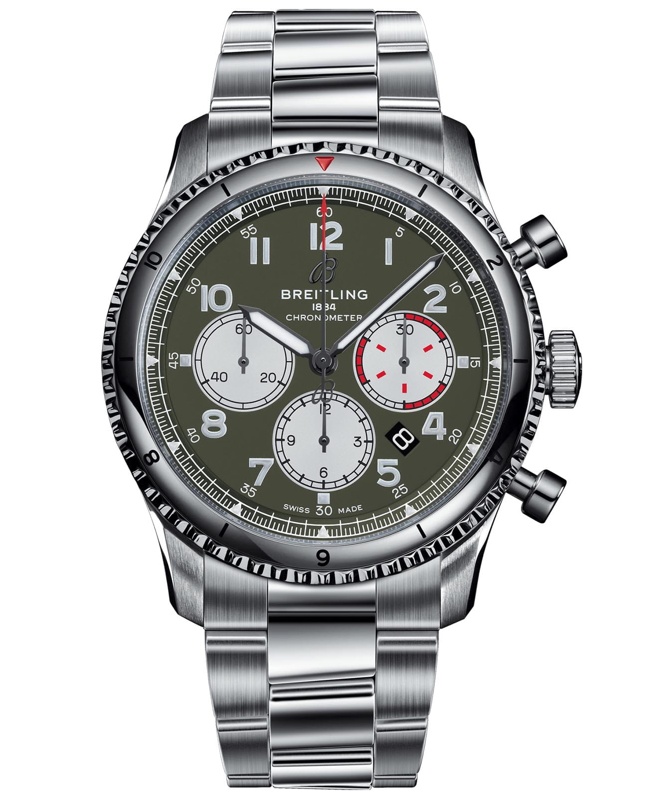 ХронографХронографФункция позволяет измерять отрезки времени с особой точностью: часы, минуты, секунды. Верным признаком хронографа является наличие на циферблате 3 дополнительных окошек-счётчиков. Aviator 8 B01 43 Curtiss Warhawk готов к работе благодаря матовому циферблату цвета милитари-грин, ремешку цвета милитари-грин и контрастным серебристым вспомогательным циферблатам. В положении 4:30 есть окно с датой. Его бьющимся сердцем является собственный механический механизм Breitling, сертифицированный Сертификат COSCСертификат COSCОфициальный сертификат, подтверждающий то, что часы ходят с особо высокой точностью. Для получения документа часы подвергаются тестовым испытаниям, разработанным швейцарским институтом тестирования хронометров COSC. Допустимая норма для механических часов -4/+6 секунд в день, для кварцевых моделей +/- 0,07 секунд в день. мануфактурный калибр 01, который обеспечивает колоссальный 70-часовой запас хода. Его эффектная задняя крышка из прозрачного сапфираСапфировое стеклоПрочный и надёжный материал из кристалла сапфира синтетического происхождения, характеризующийся особой твёрдостью и устойчивостью к царапинам и повреждениям. украшена надписью Curtiss и ярким изображением P-40 Warhawk, мгновенно узнаваемым по эффектному логотипу "акулья пасть" на носу самолета. ХронографХронографФункция позволяет измерять отрезки времени с особой точностью: часы, минуты, секунды. Верным признаком хронографа является наличие на циферблате 3 дополнительных окошек-счётчиков. Aviator 8 B01 43 Curtiss Warhawk имеет 43-миллиметровый корпус из нержавеющей стали и водонепроницаемость до 10 бар (100 метров). Благодаря светящимся цифрам, часовой и минутной стрелкам он разборчив при любых условиях освещения.