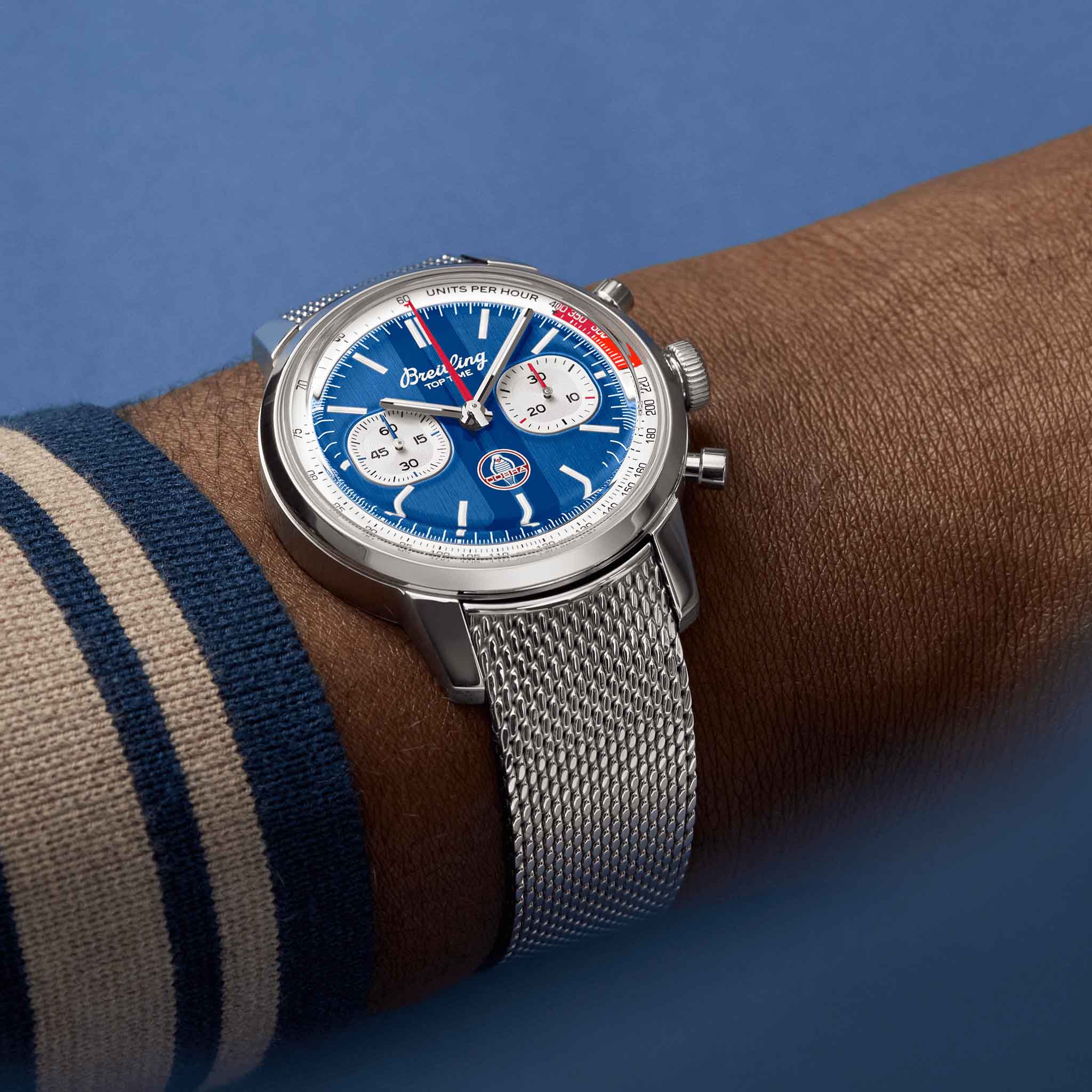 Мужские швейцарские часы-хронографХронографФункция позволяет измерять отрезки времени с особой точностью: часы, минуты, секунды. Верным признаком хронографа является наличие на циферблате 3 дополнительных окошек-счётчиков. с тахиметромТахиметрРазмеченная шкала, располагается на ободке или безеле часов. Тахиметр позволяет рассчитать скорость на определённом участке пути, расстояние измеряется в километрах или милях. Breitling Top Time B01 Shelby Cobra AB01763A1C1A1, механический механизм (автоматический калибр) с высокой точностью. Сапфировое стеклоСапфировое стеклоПрочный и надёжный материал из кристалла сапфира синтетического происхождения, характеризующийся особой твёрдостью и устойчивостью к царапинам и повреждениям. устойчивое к появлению царапин, обладающее высокой прозрачностью. Класс водозащиты: 100 метров, позволит плавать, нырять и заниматься другими водными видами спорта. Корпус часов изготовлен из стали. Стрелки и метки с люминесцентным покрытиемЛюминесцентное покрытиеПозволяет считывать показания времени в темноте. Производители наносят на стрелки, часовые индексы, безель или поверхность циферблата светонакопительный состав, дающий холодное свечение.. Стальной браслет с застёжкой-бабочкой с кнопкамиЗастёжка "бабочка"Такой вид застёжки дополняется предохранителями, помогающими избежать случайного раскрытия браслета. Обладают изящным исполнением. . Неподвижный безельБезельВнешний ободок, закрепляющий стекло. В спортивных часах так называется поворотное кольцо с делениями на циферблате, выполняет роль таймера – замеряет отрезки времени на шкале. Неподвижный безель – элемент декора. Однонаправленно вращающийся безель на дайверских часах позволяет фиксировать моменты погружения и выныривания на поверхность..