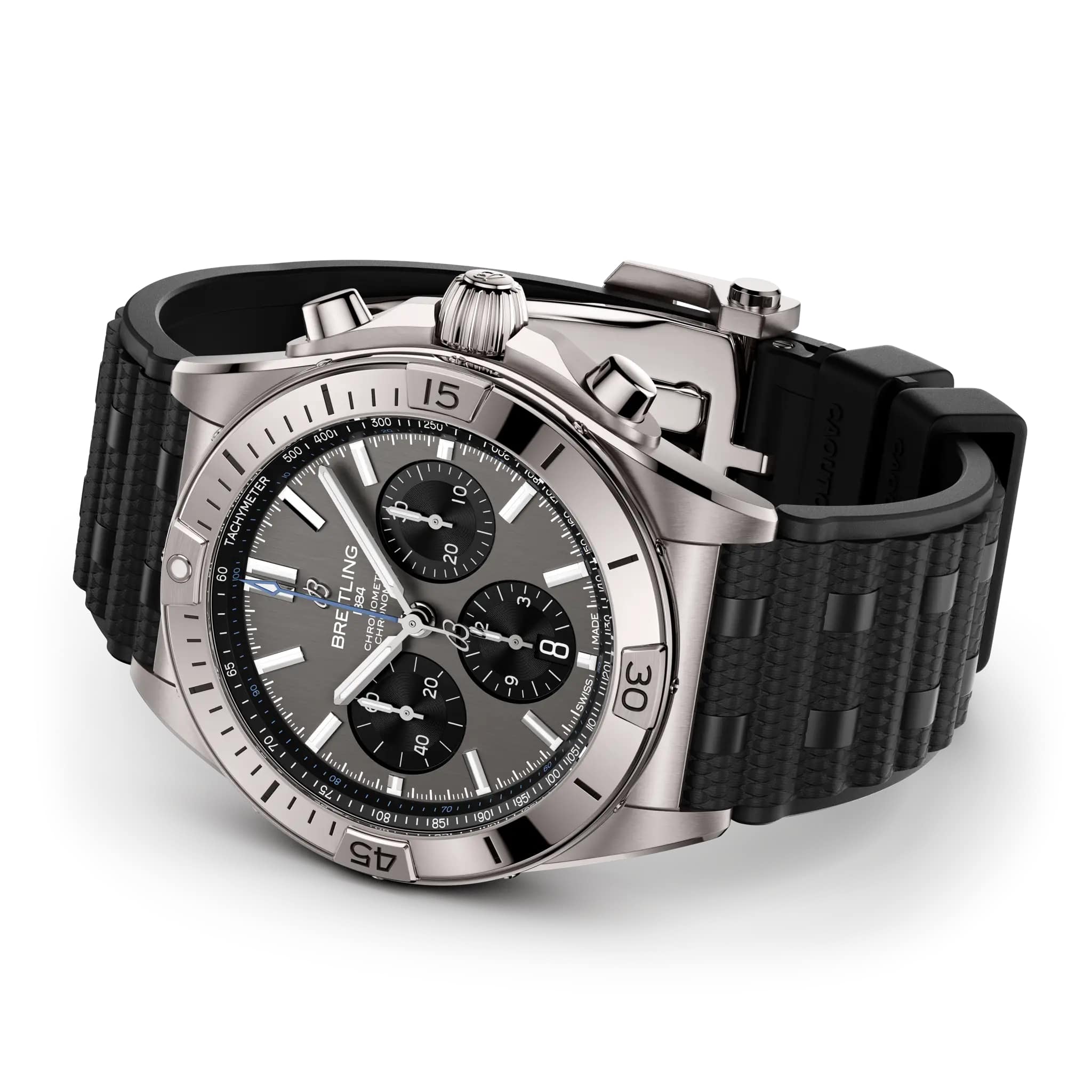 Мужские швейцарские часы-хронограф с секундомером Breitling Chronomat B01 42 EB0134101M1S1, механический механизм (автоматический калибр) с высокой точностью. Сапфировое стеклоСапфировое стеклоПрочный и надёжный материал из кристалла сапфира синтетического происхождения, характеризующийся особой твёрдостью и устойчивостью к царапинам и повреждениям. устойчивое к появлению царапин, обладающее высокой прозрачностью. Класс водозащиты: 200 метров, позволит плавать, нырять и заниматься другими водными видами спорта. Корпус часов изготовлен из нержавеющей стали. Браслет из каучука на раскладной застёжкеРаскладная застёжкаТакой тип застёжки используется только на браслетах из металла. Она никогда не раскрывается полностью, происходит разделение на 2 и более частей. Раскладывающая застёжка снизит вероятность потери часов к минимуму.. Стрелки и метки с люминесцентным покрытиемЛюминесцентное покрытиеПозволяет считывать показания времени в темноте. Производители наносят на стрелки, часовые индексы, безель или поверхность циферблата светонакопительный состав, дающий холодное свечение.. Шкала тахиметра на циферблате. Окошко даты находится в положении 6 часов.