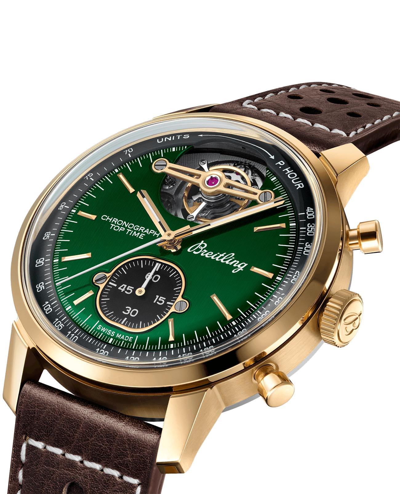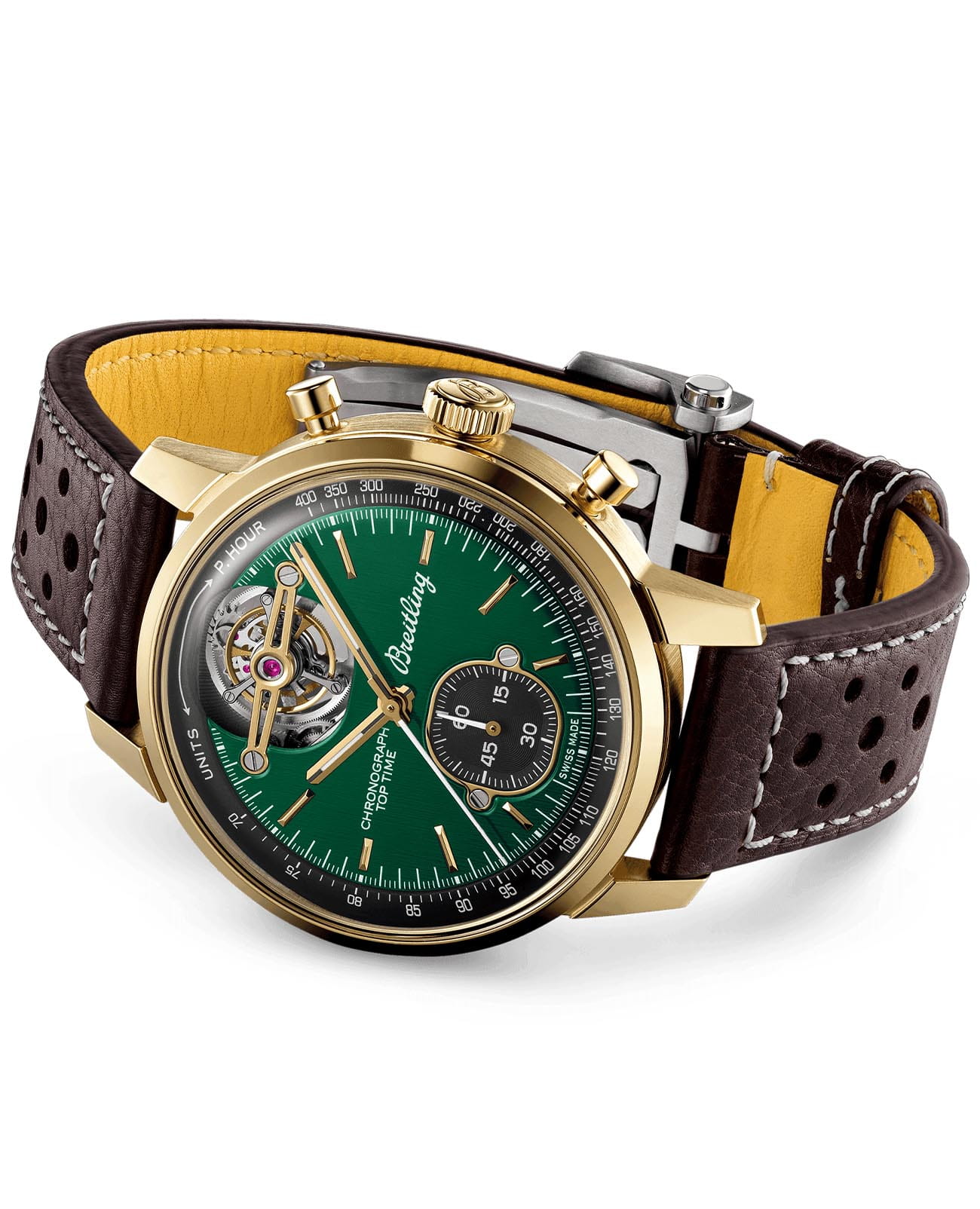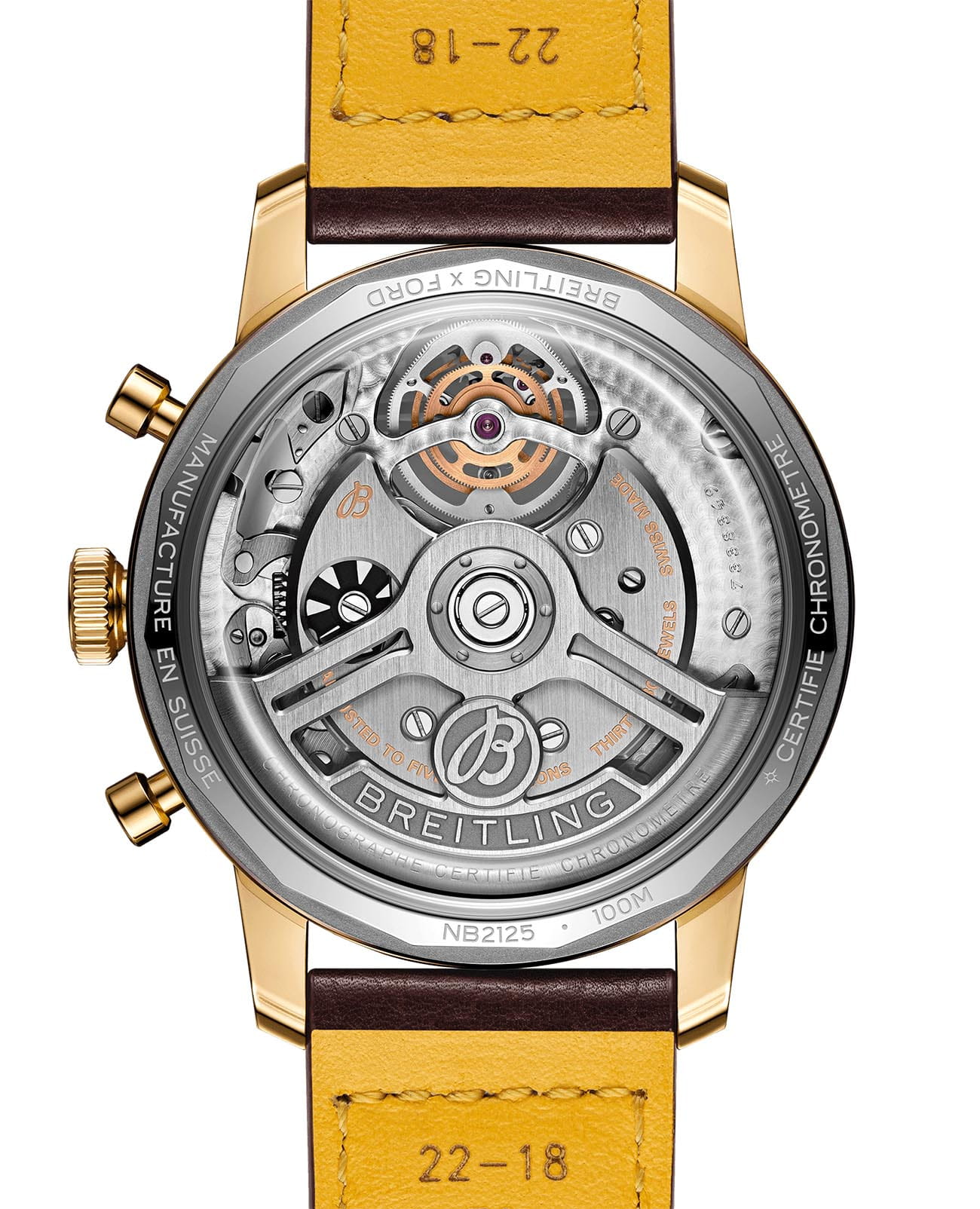 Мужские наручные часы c хронографомХронографФункция позволяет измерять отрезки времени с особой точностью: часы, минуты, секунды. Верным признаком хронографа является наличие на циферблате 3 дополнительных окошек-счётчиков. Breitling Top Time B21 Ford Mustang NB21251A1L1X1, надежный автоматический механизм. Корпус часов изготовлен из бронзы. Практичный кожаный ремешок на стандартной застёжке. ТахиметрТахиметрРазмеченная шкала, располагается на ободке или безеле часов. Тахиметр позволяет рассчитать скорость на определённом участке пути, расстояние измеряется в километрах или милях., сапфировое стеклоСапфировое стеклоПрочный и надёжный материал из кристалла сапфира синтетического происхождения, характеризующийся особой твёрдостью и устойчивостью к царапинам и повреждениям. повышенной прозрачности, устойчивое к мелким механическим повреждениям. Стрелки и метки с люминесцентным покрытиемЛюминесцентное покрытиеПозволяет считывать показания времени в темноте. Производители наносят на стрелки, часовые индексы, безель или поверхность циферблата светонакопительный состав, дающий холодное свечение..