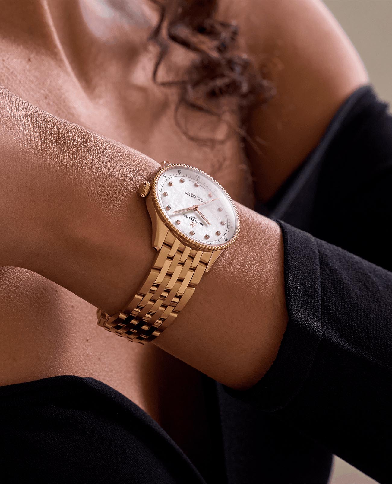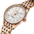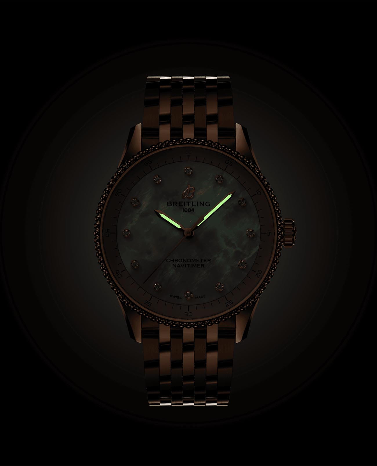 . Браслет на застёжке-бабочке с кнопкамиЗастёжка "бабочка"Такой вид застёжки дополняется предохранителями, помогающими избежать случайного раскрытия браслета. Обладают изящным исполнением. . Стрелки с люминесцентным покрытиемЛюминесцентное покрытиеПозволяет считывать показания времени в темноте. Производители наносят на стрелки, часовые индексы, безель или поверхность циферблата светонакопительный состав, дающий холодное свечение.. Циферблат инкрустирован бриллантами.