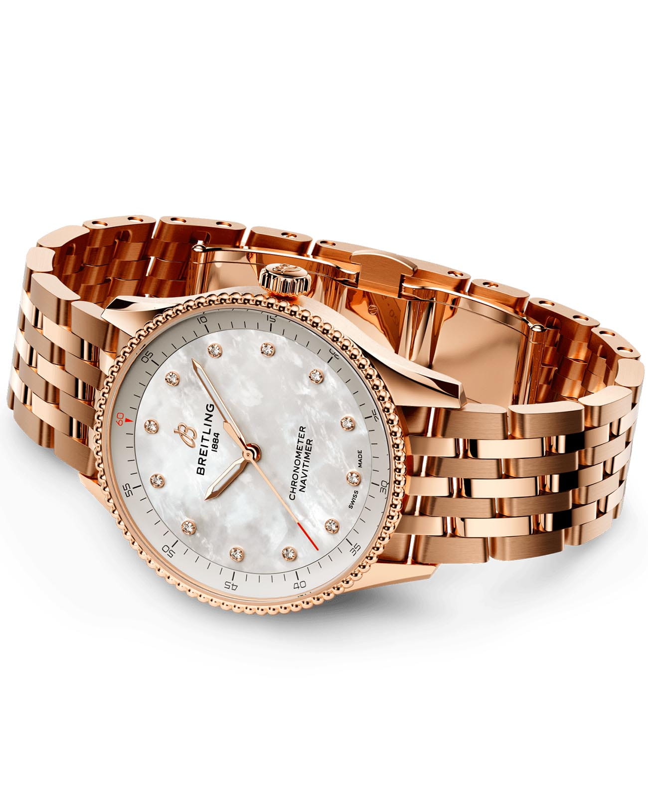 Швейцарские унисекс часы-хронометр Breitling Navitimer Automatic 32 R77320E61A1R1, механический механизм (автоматический калибр) с высокой точностью. Сапфировое стеклоСапфировое стеклоПрочный и надёжный материал из кристалла сапфира синтетического происхождения, характеризующийся особой твёрдостью и устойчивостью к царапинам и повреждениям. устойчивое к появлению царапин, обладающее высокой прозрачностью. Класс водозащиты: 50 метров, позволит защитить корпус от случайных брызг или капель дождя. Корпус и браслет часов изготовлены из красного 18-каратного золота18-каратное золотоОбозначение по каратной системе пробирования, оно показывает, сколько драгоценного металла содержится в изделии. 18 карат - в составе 75% чистого золота, соответствует 750 пробе.