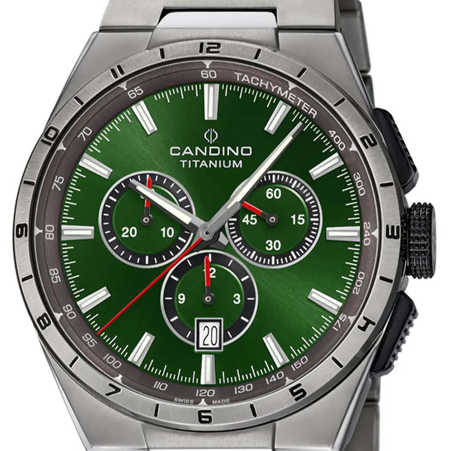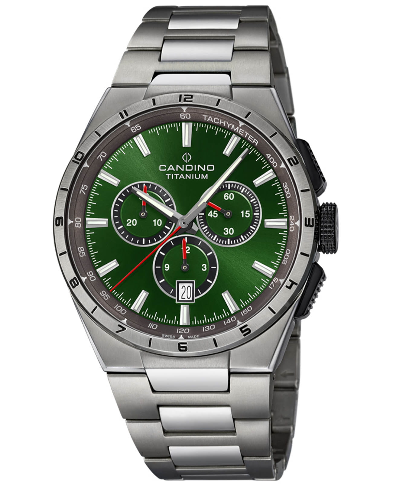 Швейцарские мужские наручные часы-хронографХронографФункция позволяет измерять отрезки времени с особой точностью: часы, минуты, секунды. Верным признаком хронографа является наличие на циферблате 3 дополнительных окошек-счётчиков. с секундомеромСекундомерСекундоме́р — прибор, способный измерять интервалы времени с точностью до долей секунды. Candino Titanium Chrono C4603/C, кварцевый механизм с высокой точностью. Сапфировое стеклоСапфировое стеклоПрочный и надёжный материал из кристалла сапфира синтетического происхождения, характеризующийся особой твёрдостью и устойчивостью к царапинам и повреждениям. устойчивое к появлению царапин, обладающее высокой прозрачностью. Класс водозащиты: 100 метров, позволит плавать, нырять и заниматься другими водными видами спорта. Корпус часов изготовлен из титана. Титановый браслет на раскладной застёжкеРаскладная застёжкаТакой тип застёжки используется только на браслетах из металла. Она никогда не раскрывается полностью, происходит разделение на 2 и более частей. Раскладывающая застёжка снизит вероятность потери часов к минимуму.. Стрелки и метки с люминесцентным покрытиемЛюминесцентное покрытиеПозволяет считывать показания времени в темноте. Производители наносят на стрелки, часовые индексы, безель или поверхность циферблата светонакопительный состав, дающий холодное свечение.. Окошко даты находится в положении 6 часов.