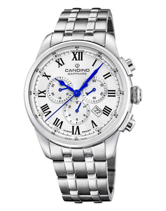 Швейцарские мужские наручные часы-хронографХронографФункция позволяет измерять отрезки времени с особой точностью: часы, минуты, секунды. Верным признаком хронографа является наличие на циферблате 3 дополнительных окошек-счётчиков. Candino Chronograph C4744/4, кварцевый механизм с высокой точностью. Сапфировое стеклоСапфировое стеклоПрочный и надёжный материал из кристалла сапфира синтетического происхождения, характеризующийся особой твёрдостью и устойчивостью к царапинам и повреждениям. устойчивое к появлению царапин, обладающее высокой прозрачностью. Часы, минуты, секунды. Индикация даты. Класс водозащиты: 100 метров, позволит плавать, нырять и заниматься другими водными видами спорта. Раскладная застёжкаРаскладная застёжкаТакой тип застёжки используется только на браслетах из металла. Она никогда не раскрывается полностью, происходит разделение на 2 и более частей. Раскладывающая застёжка снизит вероятность потери часов к минимуму. с фиксатором. Корпус часов изготовлен из нержавеющей стали. Стрелки и метки с люминесцентным покрытиемЛюминесцентное покрытиеПозволяет считывать показания времени в темноте. Производители наносят на стрелки, часовые индексы, безель или поверхность циферблата светонакопительный состав, дающий холодное свечение..