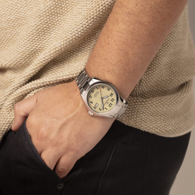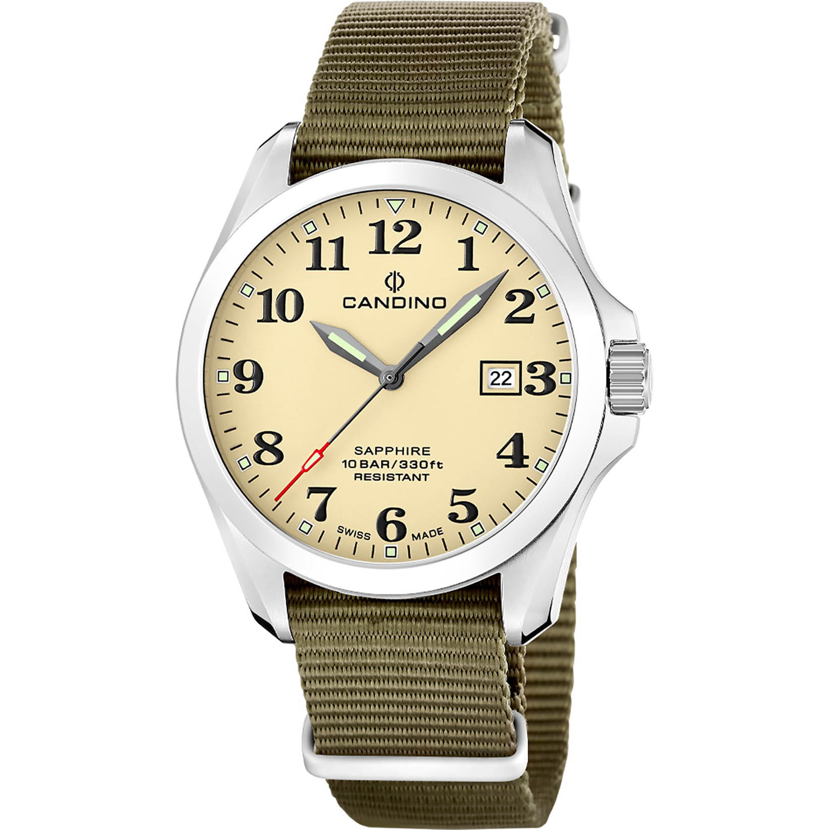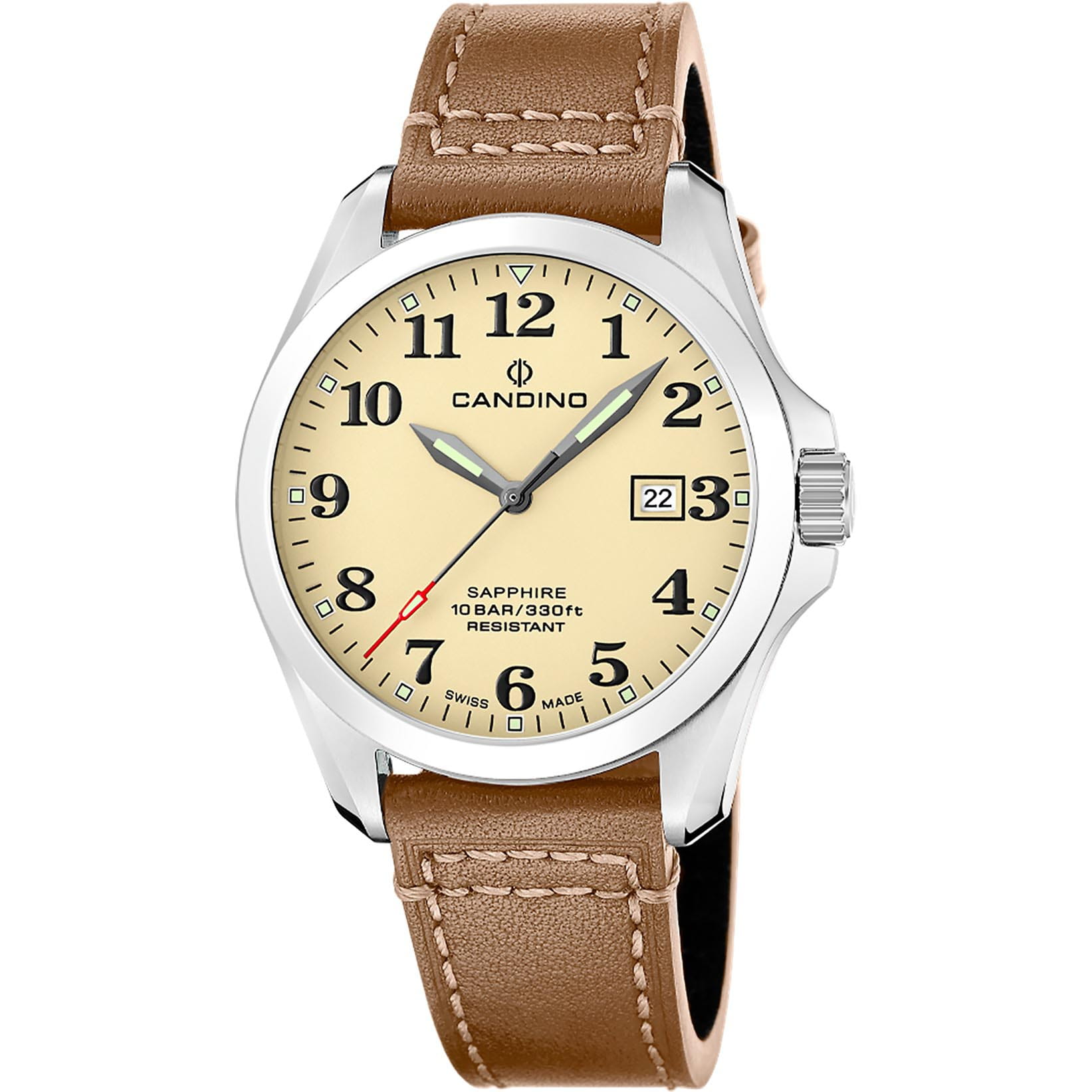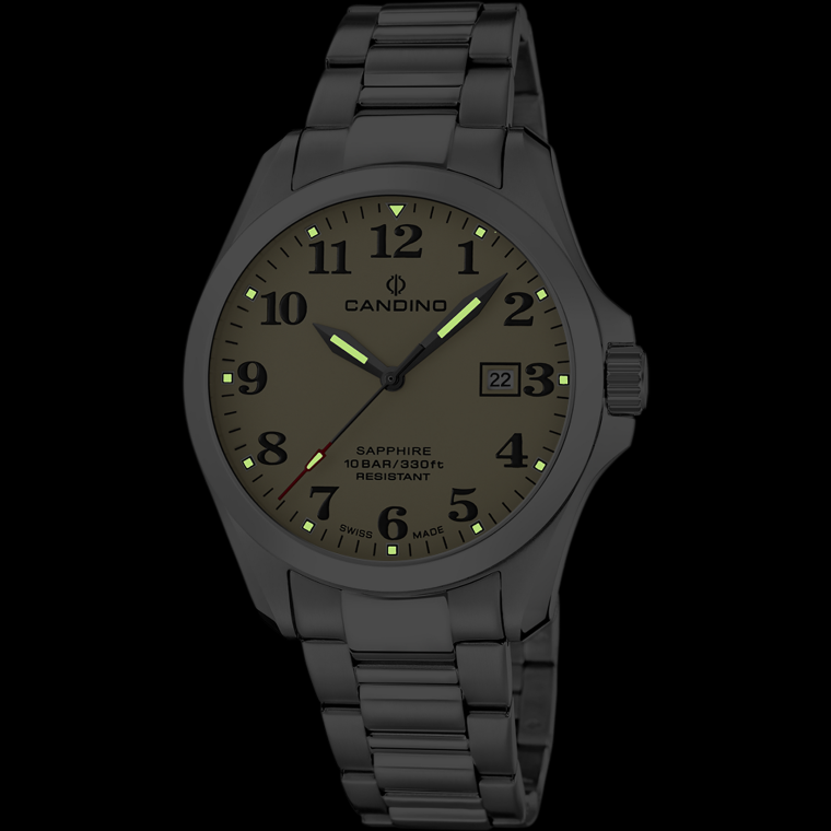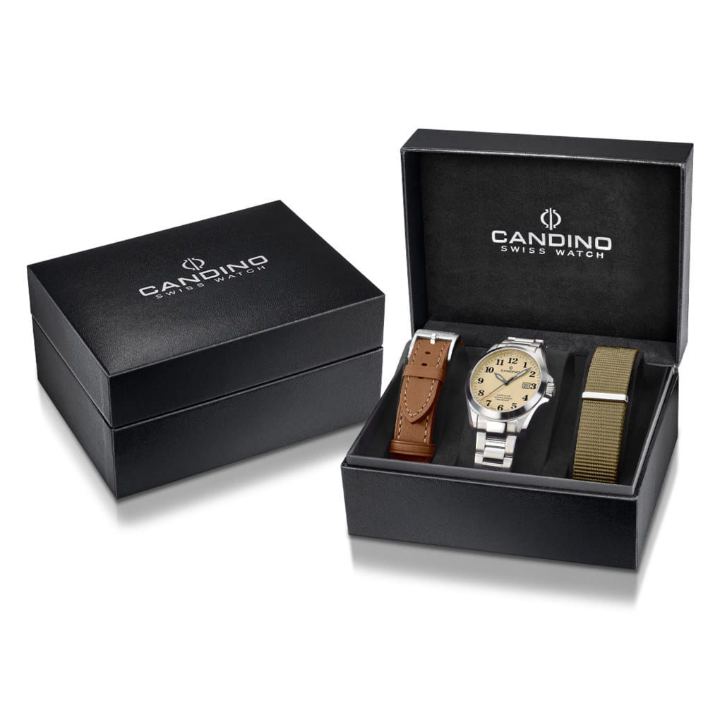 Мужские кварцевые часы Candino C4785/1 — это стильный и надёжный аксессуар швейцарского производства, подчёркивающий индивидуальность и хороший вкус. Корпус круглой формы выполнен из нержавеющей стали и защищён сапфировым стекломСапфировое стеклоПрочный и надёжный материал из кристалла сапфира синтетического происхождения, характеризующийся особой твёрдостью и устойчивостью к царапинам и повреждениям., устойчивым к царапинам. Циферблат бежевого цвета оформлен арабскими цифрами, а стрелки и метки оснащены люминесцентным покрытиемЛюминесцентное покрытиеПозволяет считывать показания времени в темноте. Производители наносят на стрелки, часовые индексы, безель или поверхность циферблата светонакопительный состав, дающий холодное свечение., обеспечивающим хорошую читаемость в темноте. Окошко даты расположено на отметке 3 часа, что делает часы не только элегантными, но и функциональными. Часы оснащены стальным браслетом серебристого цвета с раскладной застёжкойРаскладная застёжкаТакой тип застёжки используется только на браслетах из металла. Она никогда не раскрывается полностью, происходит разделение на 2 и более частей. Раскладывающая застёжка снизит вероятность потери часов к минимуму., который обеспечивает комфорт при ношении. Водонепроницаемость 100 м позволяет использовать часы в повседневных условиях, включая плавание. Модель сочетает в себе классический стиль, швейцарское качество и надёжность, оставаясь универсальным выбором для любого случая. В комплекте предусмотрены два ремешка из кожи и текстиля.