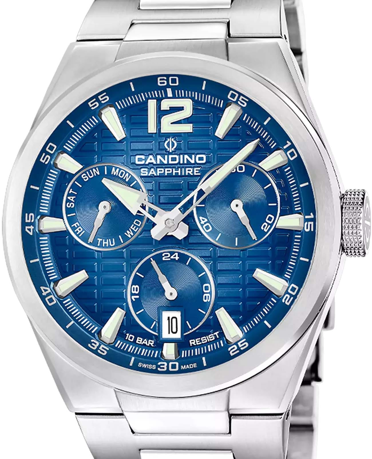 Мужские кварцевые часы Candino — это сочетание классического дизайна, надёжности и швейцарского качества. Корпус диаметром 43 мм и толщиной 11,5 мм выполнен из нержавеющей стали. Циферблат синего цвета оформлен индексами в виде штрихов и стрелками. Указатели дня недели и даты расположены в центре циферблата. Стрелки и метки с люминесцентным покрытиемЛюминесцентное покрытиеПозволяет считывать показания времени в темноте. Производители наносят на стрелки, часовые индексы, безель или поверхность циферблата светонакопительный состав, дающий холодное свечение., обеспечивающим хорошую читаемость в темноте. Циферблат защищён сапфировым стекломСапфировое стеклоПрочный и надёжный материал из кристалла сапфира синтетического происхождения, характеризующийся особой твёрдостью и устойчивостью к царапинам и повреждениям., устойчивым к царапинам. Механизм — кварцевый произведённый в Швейцарии. Часы оснащены стальным браслетом с раскладной застёжкойРаскладная застёжкаТакой тип застёжки используется только на браслетах из металла. Она никогда не раскрывается полностью, происходит разделение на 2 и более частей. Раскладывающая застёжка снизит вероятность потери часов к минимуму.. Водонепроницаемость 100 м позволяет использовать часы для плавания и повседневного ношения. Гарантия — 2 года. Идеальный выбор для тех, кто ценит стиль, функциональность и точность.