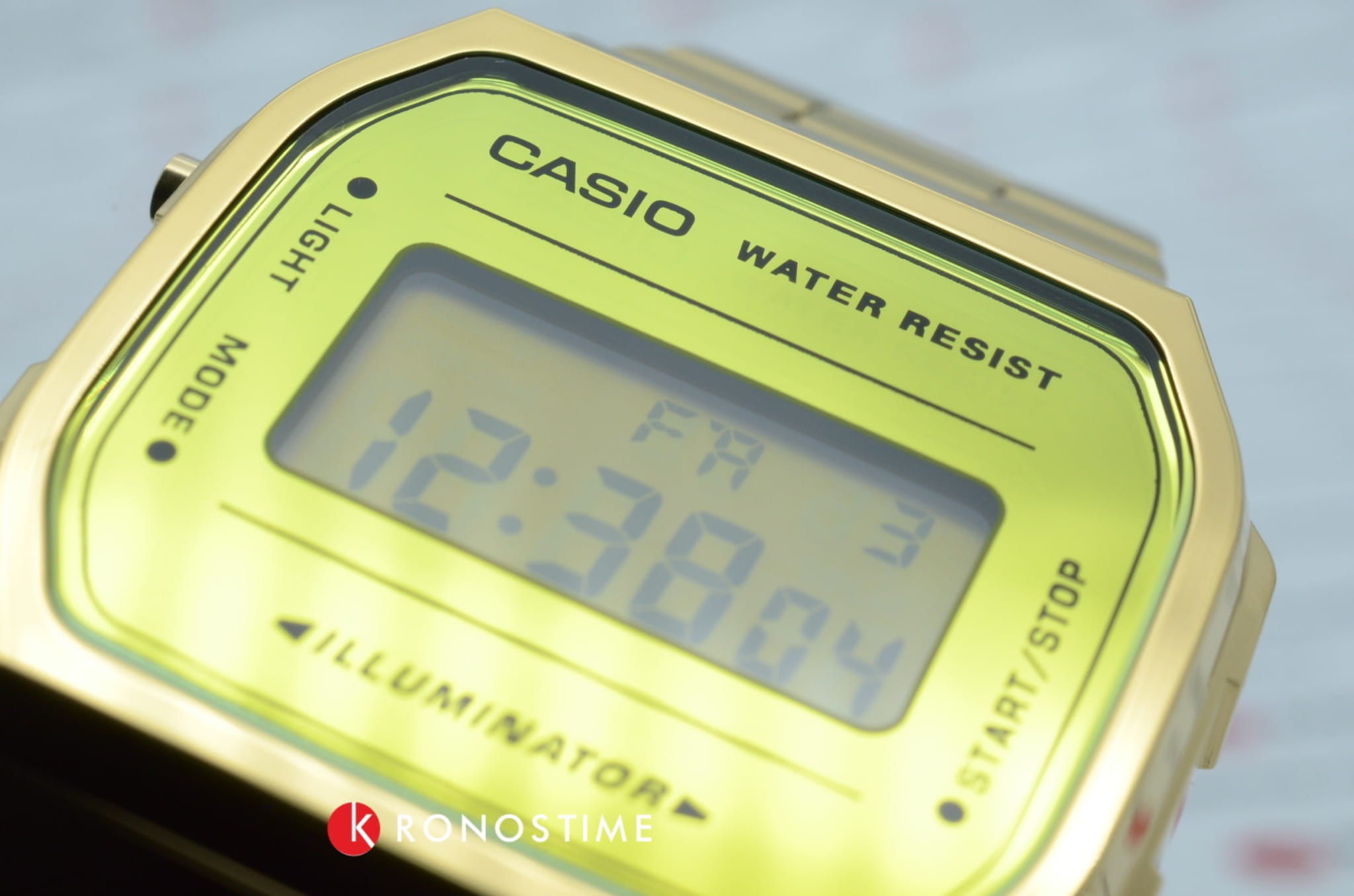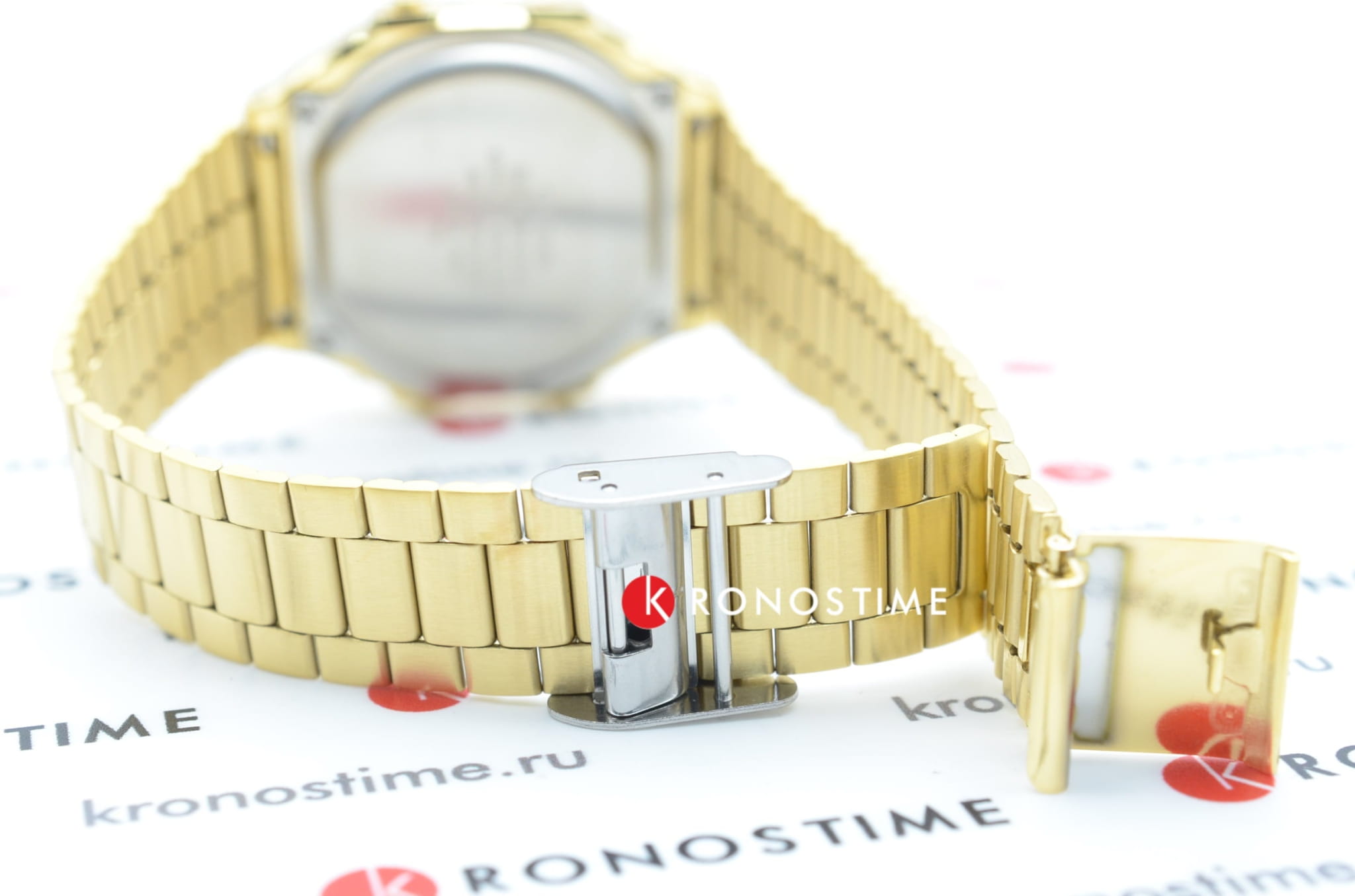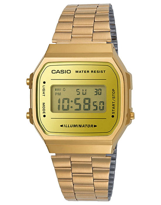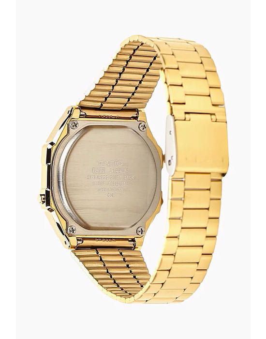 Корпус в золотистом цвете из прочного полимерного пластика имеет легендарную 8-угольную форму, компактный аксессуар одинаково хорошо смотрится как с офисной рубашкой, так и с повседневной футболкой. Электронный дисплей имеет подсветку, его надёжную защиту от повреждений обеспечивает минеральное стекло. Браслет из нержавеющей стали 316L на долгие годы сохранит первоначальный вид. Будильник, автоматический календарь. Габариты: 38,6 x 36,3 x 9,6 мм.
