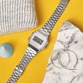 Серебристая цветовая гамма подойдёт к любой одежде, предоставляя простор для экспериментов. Цифровой дисплей оснащён функцией подсветки, облегчающей считывание информации в темноте. Среди дополнительных возможностей числятся будильник, календарь, секундомер. Ударопрочный корпус сделан из полимерного пластика. Минеральное стекло отличается устойчивостью к появлению царапин. Габариты: 38,6 x 36,3 x 9,6 мм.