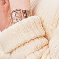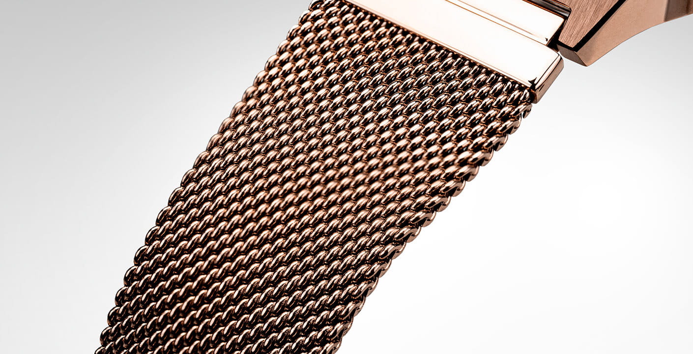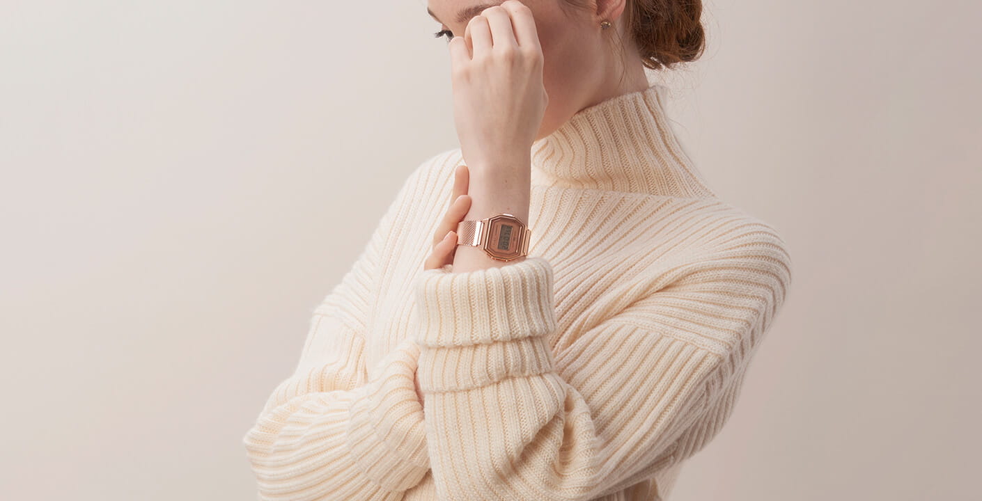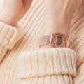 Уже известный 8-угольный ударопрочный корпусУдаропрочный корпусМеханизм заключён в корпус, выполненный из современных материалов, устойчивых к ударам, механическим повреждениям и падению с высоты: инновационный пластик, карбон, нержавеющая сталь, титан. выполнен из нержавеющей стали 316L, как и стильный браслет миланского плетения. Оригинально выглядит переливающаяся вставка, окружающая цифровое окошко. Кварцевый высокоточный механизм работает от батарейки, аккумулятор рассчитан на 3 года эксплуатации. Светодиодная подсветкаСветодиодная подсветкаСветодиодная или LED-подсветка обеспечивает появление яркого холодного свечения за счёт LED-элементов - маленьких лампочек. Они потребляют минимальное количество энергии, чаще всего можно встретить 1 светодиод, в нижней части циферблата. дисплея. Долговечное IP-покрытиеIP-покрытиеМетод ионного напыления. Демонстрирует повышенную устойчивость к истиранию, окислению и химическим веществам. Под воздействием высокого давления и температуры около 1500°C молекулы металла надёжно соединяются с частицами корпуса часов. цвета розового золота. Минеральное стекло устойчиво к появлению царапин. Автоматический календарь, будильник, секундомер. Габариты: 38 x 39,6 x 7,3 мм.