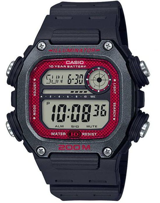 Необычная модель бюджетного ценового сегмента отличается внушительным внешним видом с ярким красным обрамлением, круглое окошко напоминает снайперский прицел, мощные выступы защищают кнопки. Ключевой особенностью аксессуара стала батарейка, рассчитанная на 10 лет безупречной работы. Корпус и ремешок из полимерного пластика. Светодиодная подсветкаСветодиодная подсветкаСветодиодная или LED-подсветка обеспечивает появление яркого холодного свечения за счёт LED-элементов - маленьких лампочек. Они потребляют минимальное количество энергии, чаще всего можно встретить 1 светодиод, в нижней части циферблата. дисплея. Органическое стекло повышенной прочности. Водонепроницаемость 200 метров. Таймер обратного отсчёта, секундомер, будильник, ежечасный сигнал, секундомер, мировое времяМировое время Полезное часовое усложнение, отображающее время в основных городах и известных областях по всему миру, оно связано с часовыми поясами, удобно для путешественников и бизнесменов. - 49 городов, автоматический календарь. Габариты: 50,4 x 50,5 x 13,5 мм.