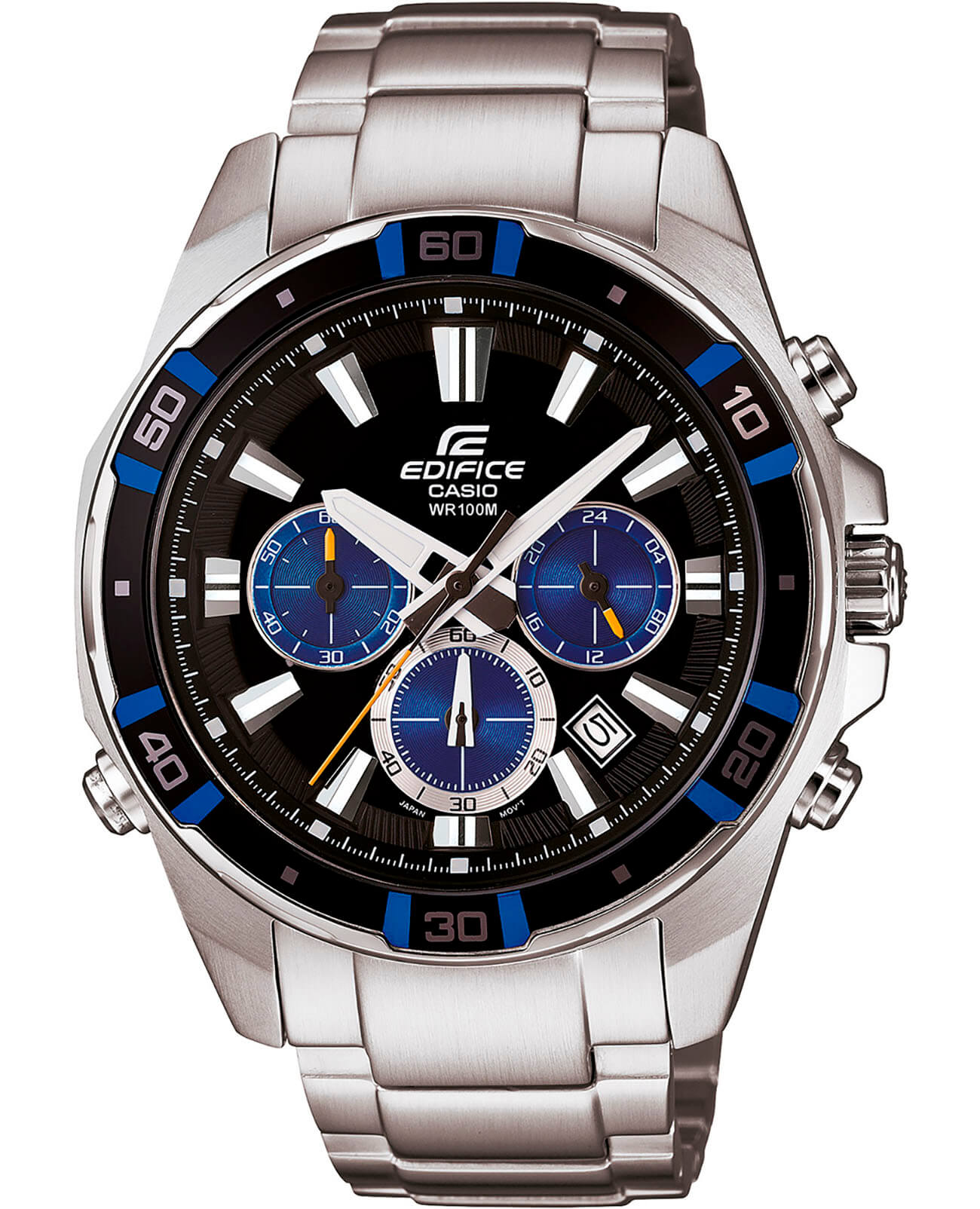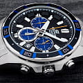 Стильные японские наручные кварцевые мужские часы. Круглый корпус и браслет часов выполнены из стали с антикоррозийными свойствами. Черный циферблат и контрастные синие  элементы дизайна. Водонепроницаемость 10 ATM. Минеральное стекло, устойчивое к появлению царапин.