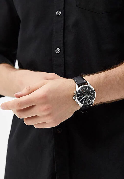 Стильный аксессуар выдержан в чёрно-серебристой цветовой гамме, что позволяет носить наручные часы с любой одеждой. Мини-счётчики хронографаХронографФункция позволяет измерять отрезки времени с особой точностью: часы, минуты, секунды. Верным признаком хронографа является наличие на циферблате 3 дополнительных окошек-счётчиков., крупная индикация времени и секундная стрелка с красным наконечником придают модели динамичный автомобильный дизайн. Стильно выглядит чёрный ремешок из натуральной кожи. Ударопрочный корпусУдаропрочный корпусМеханизм заключён в корпус, выполненный из современных материалов, устойчивых к ударам, механическим повреждениям и падению с высоты: инновационный пластик, карбон, нержавеющая сталь, титан. из нержавеющей стали защищает высокоточный кварцевый механизм. Яркая люминесцентная подсветкаЛюминесцентное покрытиеПозволяет считывать показания времени в темноте. Производители наносят на стрелки, часовые индексы, безель или поверхность циферблата светонакопительный состав, дающий холодное свечение.. Секундомер, апертура даты. Габариты: 44 x 50 x 11,6 мм.