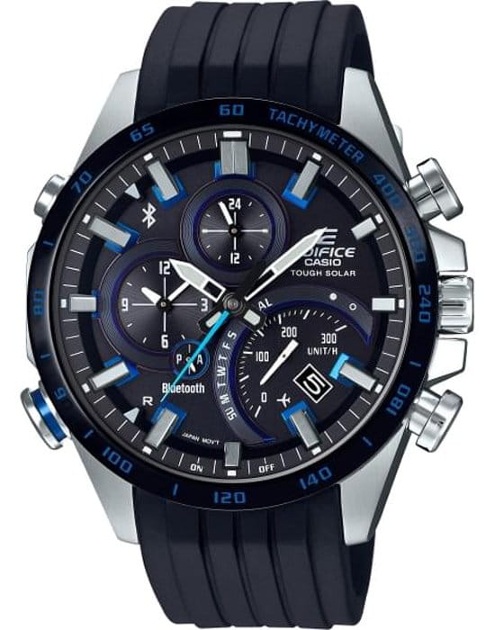 Общее исполнение аксессуара выдержано в автомобильной стилистике, тёмный циферблат отличается оригинальным расположением счётчиков. Наручные часы оснащены технологией BluetoothBluetoothСовременная технология, позволяющая синхронизировать часы с телефоном и переносить данные. Часы с Bluetooth расширяют возможности вашего смартфона и делают его использование ещё более удобным. с низким потреблением энергии, позволяющей часам считывать информацию с интернет-сервера точного времени и обеспечивать абсолютную точность времени. Питание происходит за счёт солнечной батареи - . Водонепроницаемость 100 метров. Минеральное стекло. Люминесцентная подсветкаЛюминесцентное покрытиеПозволяет считывать показания времени в темноте. Производители наносят на стрелки, часовые индексы, безель или поверхность циферблата светонакопительный состав, дающий холодное свечение.. Надёжный полимерный ремешок. Наличие авиарежима. БезельБезельВнешний ободок, закрепляющий стекло. В спортивных часах так называется поворотное кольцо с делениями на циферблате, выполняет роль таймера – замеряет отрезки времени на шкале. Неподвижный безель – элемент декора. Однонаправленно вращающийся безель на дайверских часах позволяет фиксировать моменты погружения и выныривания на поверхность. с чёрным IP-покрытиемIP-покрытиеМетод ионного напыления. Демонстрирует повышенную устойчивость к истиранию, окислению и химическим веществам. Под воздействием высокого давления и температуры около 1500°C молекулы металла надёжно соединяются с частицами корпуса часов.. Функции: уведомление о полученных сообщениях по электронной почте, поиск телефона, отображение числа и дня недели, секундомер, будильник, тахиметрТахиметрРазмеченная шкала, располагается на ободке или безеле часов. Тахиметр позволяет рассчитать скорость на определённом участке пути, расстояние измеряется в километрах или милях., расчёт средней скорости пройденного маршрута. Габариты: 52 x 48,1 x 14,2 мм.