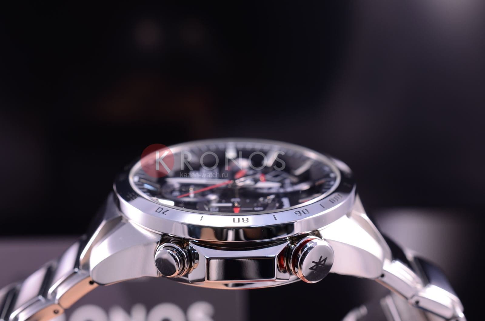 Общее исполнение аксессуара выдержано в автомобильной стилистике, тёмный циферблат отличается оригинальным расположением счётчиков. Наручные часы оснащены технологией BluetoothBluetoothСовременная технология, позволяющая синхронизировать часы с телефоном и переносить данные. Часы с Bluetooth расширяют возможности вашего смартфона и делают его использование ещё более удобным. с низким потреблением энергии, позволяющей часам считывать информацию с интернет-сервера точного времени и обеспечивать абсолютную точность времени. Питание происходит за счёт солнечной батареи - . Водонепроницаемость 100 метров. Минеральное стекло. Люминесцентная подсветкаЛюминесцентное покрытиеПозволяет считывать показания времени в темноте. Производители наносят на стрелки, часовые индексы, безель или поверхность циферблата светонакопительный состав, дающий холодное свечение.. Наличие авиарежима. Функции: уведомление о полученных сообщениях по электронной почте, поиск телефона, отображение числа и дня недели, секундомер, будильник, тахиметрТахиметрРазмеченная шкала, располагается на ободке или безеле часов. Тахиметр позволяет рассчитать скорость на определённом участке пути, расстояние измеряется в километрах или милях., расчёт средней скорости пройденного маршрута. Габариты: 52 x 48,1 x 14,2 мм.