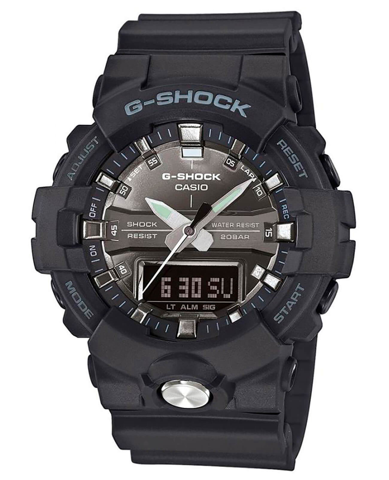 Часы в лаконичном исполнении с продуманными динамичными элементами стильно смотрятся благодаря сочетанию чёрного цвета и хромового циферблата. Модель получила уменьшенный ударопрочный корпусУдаропрочный корпусМеханизм заключён в корпус, выполненный из современных материалов, устойчивых к ударам, механическим повреждениям и падению с высоты: инновационный пластик, карбон, нержавеющая сталь, титан. из полимерного материала, если сравнивать с аксессуарами серии GA-700. Кнопка светодиодной подсветкиСветодиодная подсветкаСветодиодная или LED-подсветка обеспечивает появление яркого холодного свечения за счёт LED-элементов - маленьких лампочек. Они потребляют минимальное количество энергии, чаще всего можно встретить 1 светодиод, в нижней части циферблата. вынесена в нижнюю часть, обеспечивая удобное пользование. Японский кварцевый механизм с точностью хода +/- 15 секунд в месяц. Батарейка рассчитана на 3 года службы. Включение и отключение звука кнопок. Ремешок из высококачественного пластика. Закаленное минеральное стекло. Стрелки с люминесцентным покрытиемЛюминесцентное покрытиеПозволяет считывать показания времени в темноте. Производители наносят на стрелки, часовые индексы, безель или поверхность циферблата светонакопительный состав, дающий холодное свечение.. Водонепроницаемость до 200 метров. Автоматический календарь до 2099 года, таймер, хронографХронографФункция позволяет измерять отрезки времени с особой точностью: часы, минуты, секунды. Верным признаком хронографа является наличие на циферблате 3 дополнительных окошек-счётчиков., 5 будильников, секундомер, мировое времяМировое время Полезное часовое усложнение, отображающее время в основных городах и известных областях по всему миру, оно связано с часовыми поясами, удобно для путешественников и бизнесменов. . Габариты: 54,1 x 48,6 x 15,5 мм.