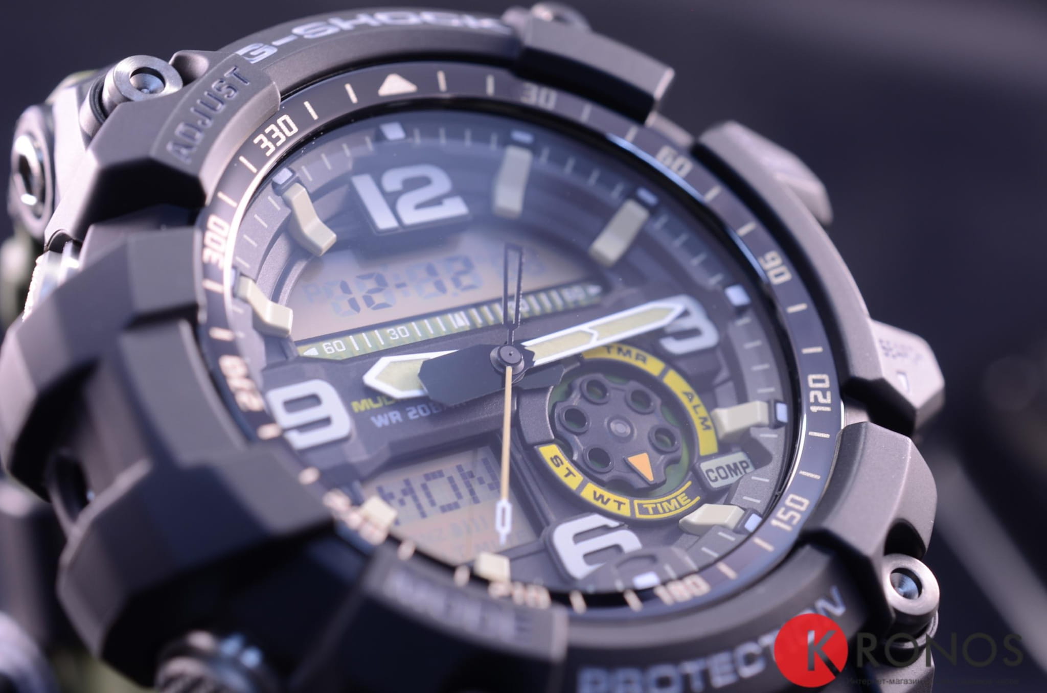 Японские мужские часы-хронографХронографФункция позволяет измерять отрезки времени с особой точностью: часы, минуты, секунды. Верным признаком хронографа является наличие на циферблате 3 дополнительных окошек-счётчиков. Casio G-Shock GG-1000-1A3 из коллекции G-Shock. При создании этой модели были учтены экстремальные ситуации, с которыми сталкиваются владельцы часов в суровых условиях пустыни. Mudmaster. Индикатор низкого заряда батареи. Минеральное стеклоМинеральное стеклоМинеральное стекло представляет собой искусственно выращенный минерал кварца. Такое стекло отличается особой устойчивостью к повреждениям и царапинам. Уступает по некоторым качествам сапфировому стеклу. устойчивое к появлению царапин, обладающее высокой прозрачностью. Ударопрочный корпусУдаропрочный корпусМеханизм заключён в корпус, выполненный из современных материалов, устойчивых к ударам, механическим повреждениям и падению с высоты: инновационный пластик, карбон, нержавеющая сталь, титан. защищает механизм от ударов и вибрации. Светодиодная подсветкаСветодиодная подсветкаСветодиодная или LED-подсветка обеспечивает появление яркого холодного свечения за счёт LED-элементов - маленьких лампочек. Они потребляют минимальное количество энергии, чаще всего можно встретить 1 светодиод, в нижней части циферблата. освещает весь циферблат. Мировое времяМировое время Полезное часовое усложнение, отображающее время в основных городах и известных областях по всему миру, оно связано с часовыми поясами, удобно для путешественников и бизнесменов. – 48 городов (29 часовых поясов). СекундомерСекундомерСекундоме́р — прибор, способный измерять интервалы времени с точностью до долей секунды. с точностью измерения 1/100 секунды и измерением до 23 часов 59 минут 59,99 cек. ТаймерТаймерОтсчитывает секунды в обратном направлении в заданном интервале времени. обратного отсчета (диапазон времени 24 часа), автоматический календарь, 12/24 отображение времени. 5 будильникаБудильникБуди́льник — часы, в заданный момент времени подающие звуковой, световой и/или в редких случаях другой сигнал., один с функцией Snooze, ежечасный сигнал. Встроенный цифровой компас. Диапазон измерения от 0° до 359° с точностью 1°. Коррекция магнитного склонения. Встроенный датчик температуры от -10° до +60°С с точностью 0,1°C. Класс водозащиты: 200 метров, позволит плавать, нырять и заниматься другими водными видами спорта. Ремешок из полимерного материала на стандартной застежке.