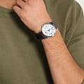 Белый циферблат с серебристыми часовыми метками и стрелками позволяет использовать часы в сочетании с одеждой любого цвета. Корпус из гипоаллергенной латуни отличается лёгкостью, коричневый ремешок из натуральной кожи надёжно обхватывает запястье. Срок службы батарейки для питания кварцевого механизма - 3 года. Люминесцентная подсветкаЛюминесцентное покрытиеПозволяет считывать показания времени в темноте. Производители наносят на стрелки, часовые индексы, безель или поверхность циферблата светонакопительный состав, дающий холодное свечение.. Сохранение водонепроницаемости при давлении до 5 бар. Минеральное стекло. Габариты: 44,9 x 50 x 9,4 мм.