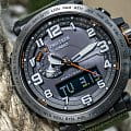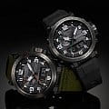Полимерный ударопрочный корпусУдаропрочный корпусМеханизм заключён в корпус, выполненный из современных материалов, устойчивых к ударам, механическим повреждениям и падению с высоты: инновационный пластик, карбон, нержавеющая сталь, титан. защищает от ударов и повреждений, безельБезельВнешний ободок, закрепляющий стекло. В спортивных часах так называется поворотное кольцо с делениями на циферблате, выполняет роль таймера – замеряет отрезки времени на шкале. Неподвижный безель – элемент декора. Однонаправленно вращающийся безель на дайверских часах позволяет фиксировать моменты погружения и выныривания на поверхность. выполнен из нержавеющей стали 316L с IP-покрытиемIP-покрытиеМетод ионного напыления. Демонстрирует повышенную устойчивость к истиранию, окислению и химическим веществам. Под воздействием высокого давления и температуры около 1500°C молекулы металла надёжно соединяются с частицами корпуса часов.. Модель имеет расширенный список функциональных возможностей, способных быстро разрешить ту или иную ситуацию. Это барометр, термометр -10°C /+60°C, высотомер с памятью данных, мировое времяМировое время Полезное часовое усложнение, отображающее время в основных городах и известных областях по всему миру, оно связано с часовыми поясами, удобно для путешественников и бизнесменов. – 29 городов, компас, таймер, секундомер, будильник, хронографХронографФункция позволяет измерять отрезки времени с особой точностью: часы, минуты, секунды. Верным признаком хронографа является наличие на циферблате 3 дополнительных окошек-счётчиков.. Осуществляется питание от источников света , индикатор уровня заряда батарейки покажет, когда часы нужно ставить на подзарядку. Японский кварцевый механизм. Минеральное стекло. Циферблат со светодиодной подсветкойСветодиодная подсветкаСветодиодная или LED-подсветка обеспечивает появление яркого холодного свечения за счёт LED-элементов - маленьких лампочек. Они потребляют минимальное количество энергии, чаще всего можно встретить 1 светодиод, в нижней части циферблата.. Люминесцентное покрытие NeobriteПодсветка NeobriteИспользование светонакопительных составов на основе сульфида цинка или алюмината стронция, яркий свет можно наблюдать на протяжении 6-10 часов после «зарядки» часов около источника света. для стрелок. Степень водостойкости WR 100. Тканевый ремешок цвета хаки. Корректировка времени по радиосигналу, UTCUTCВсемирное кординационное время, не имеющее привязки к географическому положению Гринвича, основывается на атомном отсчёте времени. Регулировка времени осуществляется более точно, чем устаревшее GMT.