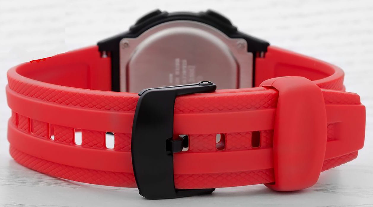 Спортивные мужские наручные часы. Автоматический календарь. 12и 24-часовой формат времени. Секундомер. Отображение времени в двух часовых поясах. Корпус - Пластиковый; Стекло - Пластик; Водозащита - 50 м. (WR 50); Материал ремешка - Пластиковый; Цвет ремешка - Красный; Цвет циферблата - Lcd.