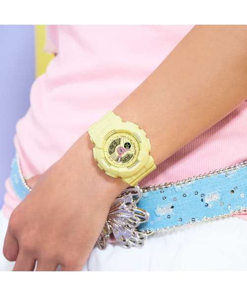Японские женские противоударные часы Casio BA-110AH-9A из коллекции Baby-G идеально подойдут для завершения повседневного образа, броская модель идеально смотрится на хрупком женском запястье. Стильный аксессуар выполнен в спортивном стиле и имеет внушительную конструкцию, нежно-желтый цвет добавляет привлекательности. Прочное минеральное стеклоМинеральное стеклоМинеральное стекло представляет собой искусственно выращенный минерал кварца. Такое стекло отличается особой устойчивостью к повреждениям и царапинам. Уступает по некоторым качествам сапфировому стеклу. устойчивое к мелким механическим повреждениям. Наручные часы обладают ударопрочным корпусомУдаропрочный корпусМеханизм заключён в корпус, выполненный из современных материалов, устойчивых к ударам, механическим повреждениям и падению с высоты: инновационный пластик, карбон, нержавеющая сталь, титан. из пластика, способным выдерживать большие нагрузки. Высокоточный кварцевый механизм. Светодиодная подсветкаСветодиодная подсветкаСветодиодная или LED-подсветка обеспечивает появление яркого холодного свечения за счёт LED-элементов - маленьких лампочек. Они потребляют минимальное количество энергии, чаще всего можно встретить 1 светодиод, в нижней части циферблата. дисплея. Стрелки оснащены люминесцентным покрытиемЛюминесцентное покрытиеПозволяет считывать показания времени в темноте. Производители наносят на стрелки, часовые индексы, безель или поверхность циферблата светонакопительный состав, дающий холодное свечение., обеспечивающим хорошую читаемость в темноте. Надежный полимерный ремешок со стандартной застежкой обеспечивает удобство. Водонепроницаемость при давлении до 10 бар. Модель обладает следующими функциями: 5 будильниковБудильникБуди́льник — часы, в заданный момент времени подающие звуковой, световой и/или в редких случаях другой сигнал., мировое времяМировое время Полезное часовое усложнение, отображающее время в основных городах и известных областях по всему миру, оно связано с часовыми поясами, удобно для путешественников и бизнесменов. , автоматический календарь, таймерТаймерОтсчитывает секунды в обратном направлении в заданном интервале времени.секундомерСекундомерСекундоме́р — прибор, способный измерять интервалы времени с точностью до долей секунды.. Идеальный выбор для тех, кто ценит стиль, функциональность и качество.