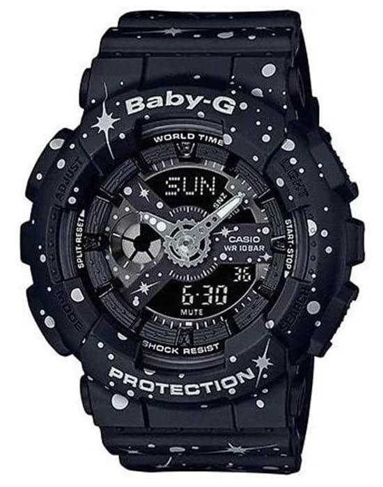 Женские противоударные японские наручные часы Casio Baby-G BA-110ST-1ADR, кварцевый механизм с высокой точностью. Класс водозащиты: 100 метров, позволит плавать, нырять и заниматься другими водными видами спорта. Корпус часов изготовлен из пластика, черного цвета.