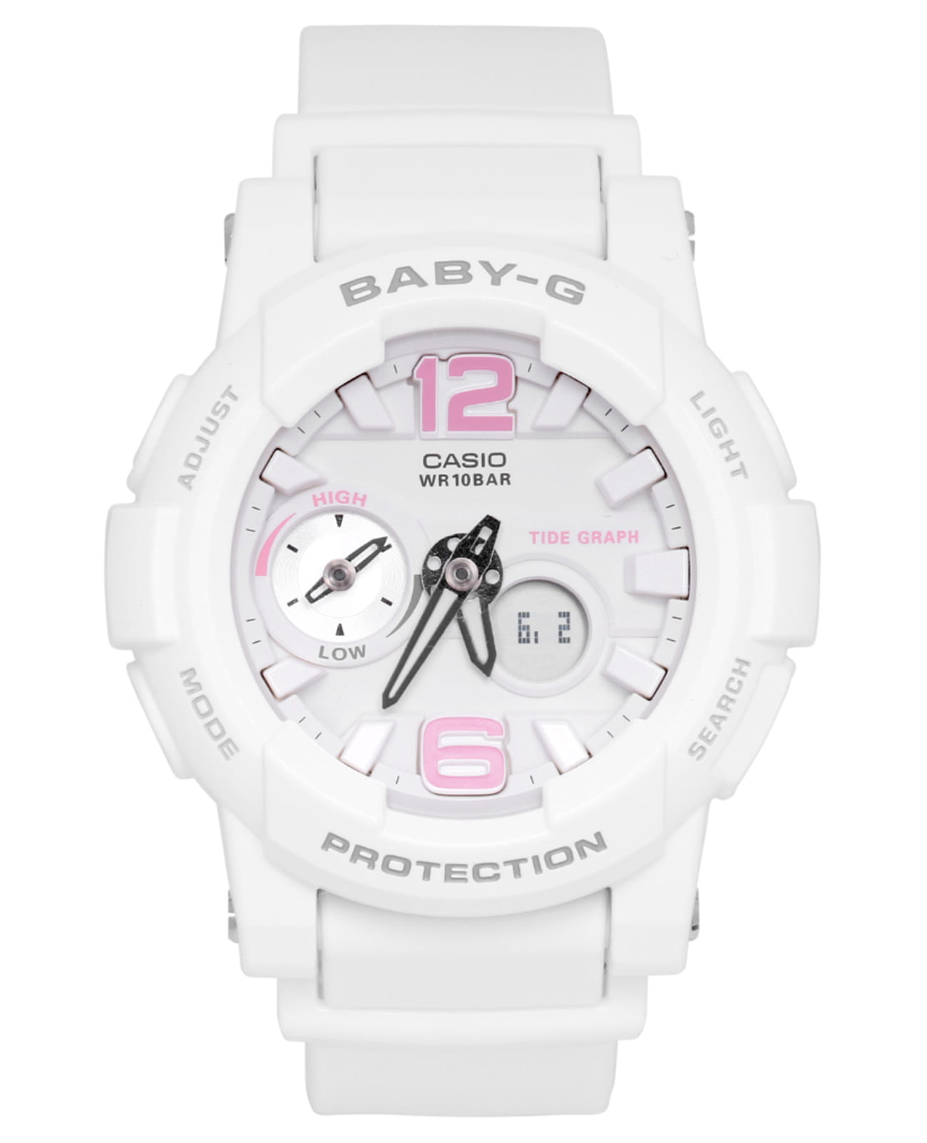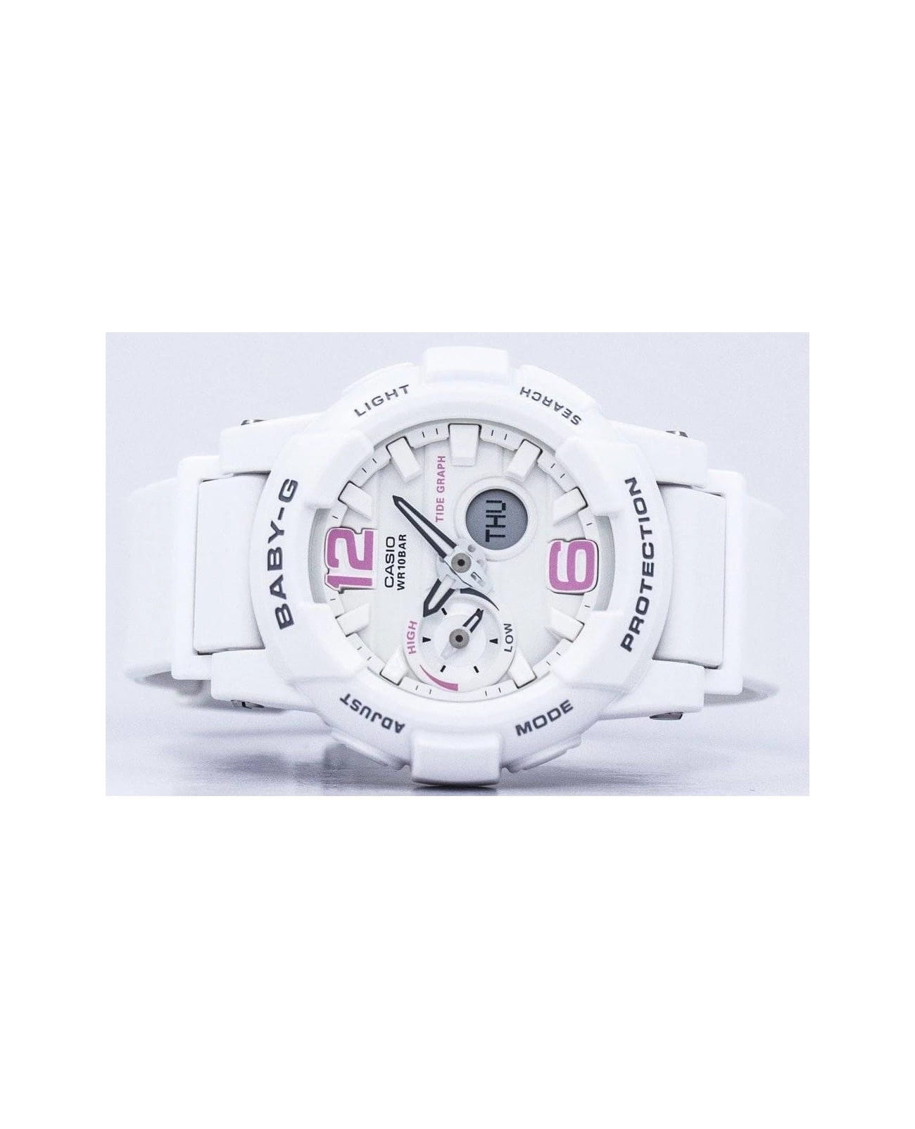 Японские женские часы-хронографХронографФункция позволяет измерять отрезки времени с особой точностью: часы, минуты, секунды. Верным признаком хронографа является наличие на циферблате 3 дополнительных окошек-счётчиков. Casio Baby-G BGA-180BE-7BDR из коллекции Baby-G. Минеральное стеклоМинеральное стеклоМинеральное стекло представляет собой искусственно выращенный минерал кварца. Такое стекло отличается особой устойчивостью к повреждениям и царапинам. Уступает по некоторым качествам сапфировому стеклу. устойчивое к появлению царапин, обладающее высокой прозрачностью. Корпус часов изготовлен из полимерного материала. Светодиодная подсветкаСветодиодная подсветкаСветодиодная или LED-подсветка обеспечивает появление яркого холодного свечения за счёт LED-элементов - маленьких лампочек. Они потребляют минимальное количество энергии, чаще всего можно встретить 1 светодиод, в нижней части циферблата. с функцией послесвечения. Ударопрочный корпусУдаропрочный корпусМеханизм заключён в корпус, выполненный из современных материалов, устойчивых к ударам, механическим повреждениям и падению с высоты: инновационный пластик, карбон, нержавеющая сталь, титан. защищает механизм от ударов и вибрации. Функция Мирового времениМировое время Полезное часовое усложнение, отображающее время в основных городах и известных областях по всему миру, оно связано с часовыми поясами, удобно для путешественников и бизнесменов. и летнего времени, второй часовой пояс. СекундомерСекундомерСекундоме́р — прибор, способный измерять интервалы времени с точностью до долей секунды. с точностью измерения 1/100 секунды и измерением до 23 часов 59 минут 59,99 cек. ТаймерТаймерОтсчитывает секунды в обратном направлении в заданном интервале времени. обратного отсчета (диапазон времени 24 часа), автоматический календарь, 12/24 отображение времени. 5 ежедневных будильниковБудильникБуди́льник — часы, в заданный момент времени подающие звуковой, световой и/или в редких случаях другой сигнал.. Термометр от -10 до 60°C . Отображение возраста и фазы луны. Отображение сведений о приливах и отливах (уровень прилива на ближайшие 12 часов, и на определенную дату и время). Функция включения/отключения звука кнопок. Функция перемещения стрелок. Класс водозащиты: 100 метров, позволит плавать без погружения. Ремешок из полимерного материала на стандартной застежке.