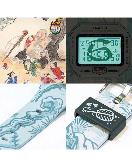 Перед вами редчайшая модель G-Shock в корпусе DW-5600 Часы выполнены в зеленом цвете, художественные элементы украшают корпус, ремешок и держатель ремешка Напомним, что модель является одной из 7 моделей в лимитированной серии "The G-Shock Seven Lucky Gods", посвященной различным азиатским божествам