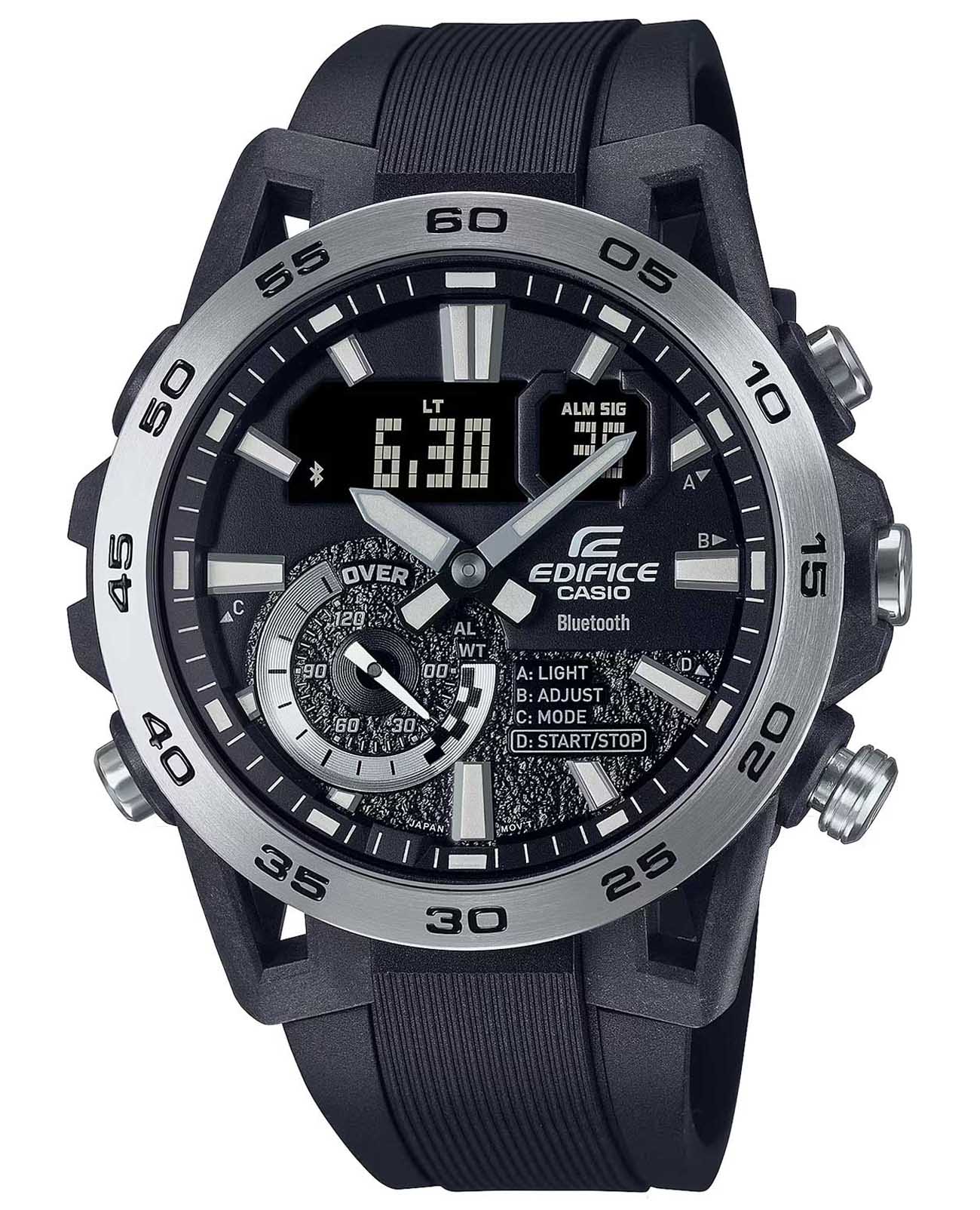 ). Автоматический переход на зимнее и летнее время, возможность включения/отключения данной функции. Переключение между домашним и мировым временем. Беспроводная технология BluetoothBluetoothСовременная технология, позволяющая синхронизировать часы с телефоном и переносить данные. Часы с Bluetooth расширяют возможности вашего смартфона и делают его использование ещё более удобным. со сверхнизким потреблением энергии для синхронизации со смартфоном. При подключении к смартфону часы корректируют текущее время, настраивают будильник, а также копируют настройки мирового времени (до 300 городов). Приложение EDIFICE Connected позволяет вести журнал показаний секундомера и прохождения этапов, вычислять разность между заданным временем и временем этапа. Отображение дней недели на шести языках. Смена отображения даты/месяца. Функции перемещения стрелок, поиска телефона и включения/отключения звука. Включение/выключение звукового сигнала по расписанию.