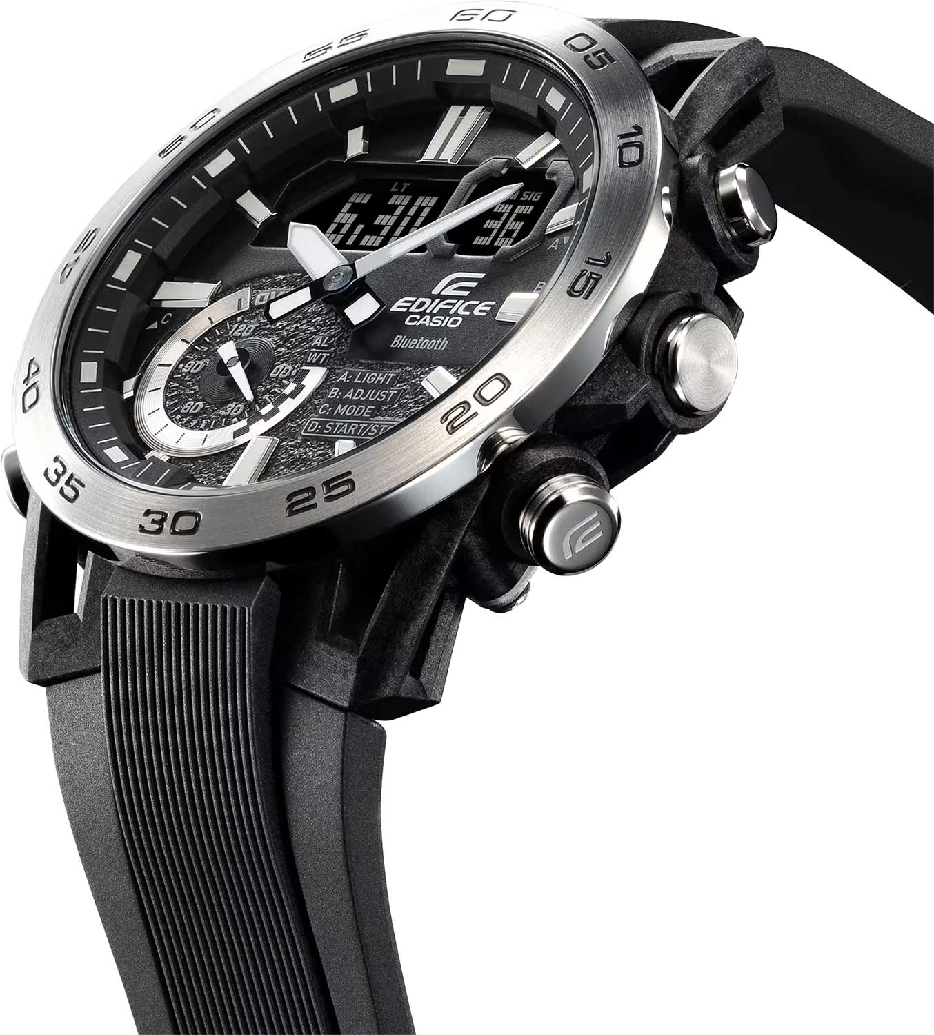 Стильная и функциональная модель в линейке Edifice пронизана насквозь спортом и духом скорости. Мужские часы, дизайн которых вдохновлен подвеской болида Формулы-1. Ушки часов разработаны по схеме четырехрычажной подвески гоночного автомобиля. Двойная светодиодная подсветка Super Illuminator с функцией Afterglow (для подсветки не нужно удерживать кнопку, время послесвечения настраивается 1,5 или 3 сек): одновременно подсвечивается аналоговый циферблат и цифровой дисплей. Цвет подсветки: белый. НеобритовоеПодсветка NeobriteИспользование светонакопительных составов на основе сульфида цинка или алюмината стронция, яркий свет можно наблюдать на протяжении 6-10 часов после «зарядки» часов около источника света. светонакопительное покрытие обеспечивает длительное послесвечение в темноте даже после кратковременного нахождения на свету. 12-ти и 24-х часовой формат времени. СекундомерСекундомерСекундоме́р — прибор, способный измерять интервалы времени с точностью до долей секунды. с двумя точностями показаний: 1/1000с (до 1ч) и 1/10с (после 1ч) и временем измерения 24ч. Сплит-хронографСплит-хронографИспользуется для измерения продолжительности нескольких временных отрезков, начинающихся одновременно, а заканчивающихся в разное время.. ТаймерТаймерОтсчитывает секунды в обратном направлении в заданном интервале времени. обратного отсчета от 1с до 24ч. Мировое время Мировое время Полезное часовое усложнение, отображающее время в основных городах и известных областях по всему миру, оно связано с часовыми поясами, удобно для путешественников и бизнесменов. – 38 городов (38 часовых поясов), всемирное координированное время (UTCUTCВсемирное кординационное время, не имеющее привязки к географическому положению Гринвича, основывается на атомном отсчёте времени. Регулировка времени осуществляется более точно, чем устаревшее GMT.