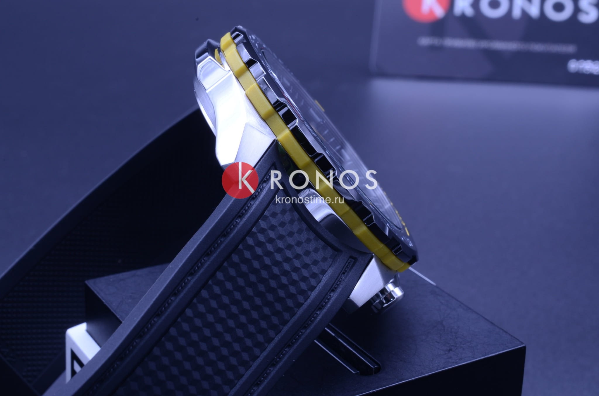 Модель отличается динамичным дизайном с уклоном в автомобильную стилистику, поклонники спортивного стиля по достоинству оценят аксессуар. Односторонне вращающийся безельБезельВнешний ободок, закрепляющий стекло. В спортивных часах так называется поворотное кольцо с делениями на циферблате, выполняет роль таймера – замеряет отрезки времени на шкале. Неподвижный безель – элемент декора. Однонаправленно вращающийся безель на дайверских часах позволяет фиксировать моменты погружения и выныривания на поверхность. имеет цветное IP-покрытиеIP-покрытиеМетод ионного напыления. Демонстрирует повышенную устойчивость к истиранию, окислению и химическим веществам. Под воздействием высокого давления и температуры около 1500°C молекулы металла надёжно соединяются с частицами корпуса часов., дополнительно защищающее от царапин. Кварцевый механизм с точностью хода +/- 20 секунд в месяц. Срок службы батарейки - 3 года. Заводная головка с защитой. Закручивающаяся задняя крышка. Водонепроницаемость 100 метров. Противоударный корпусУдаропрочный корпусМеханизм заключён в корпус, выполненный из современных материалов, устойчивых к ударам, механическим повреждениям и падению с высоты: инновационный пластик, карбон, нержавеющая сталь, титан. из нержавеющей стали 316L. Полимерный ремешок. Минеральное стекло, устойчивое к царапинам. Подсветка NeobriteПодсветка NeobriteИспользование светонакопительных составов на основе сульфида цинка или алюмината стронция, яркий свет можно наблюдать на протяжении 6-10 часов после «зарядки» часов около источника света.. Секундомер, хронографХронографФункция позволяет измерять отрезки времени с особой точностью: часы, минуты, секунды. Верным признаком хронографа является наличие на циферблате 3 дополнительных окошек-счётчиков., индикация числа. Габариты: 49,3 x 43,2 x 11,7 мм.