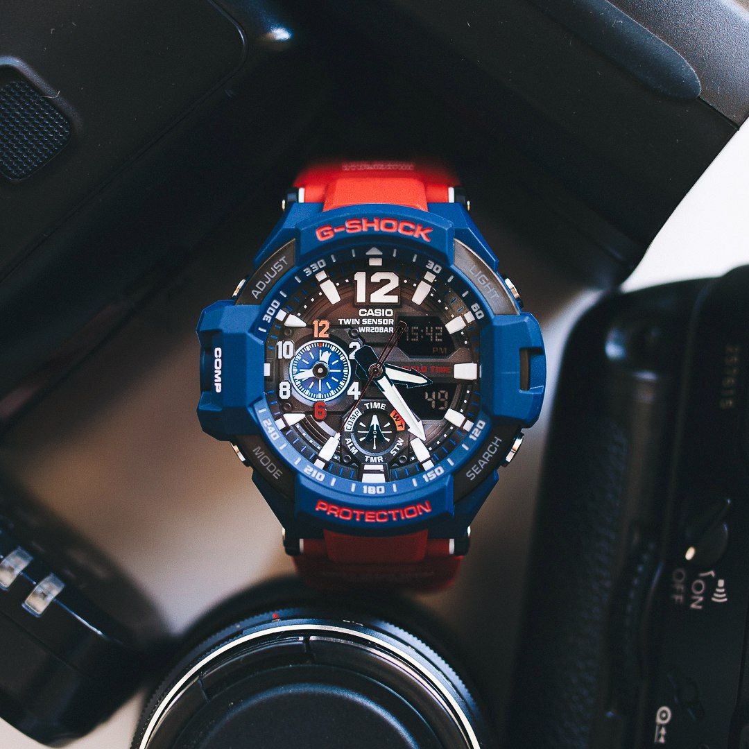 Противоударные спортивные мужские часы с компасом Casio G-Shock GA-1100-2ADR, электронный механизм с высокой точностью. Класс водозащиты: 200 метров, позволит плавать, нырять и заниматься другими водными видами спорта. Корпус часов изготовлен из пластика, разноцветного цвета.